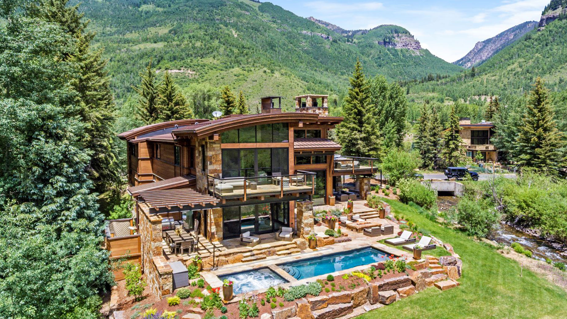 A significant focus of the design was creating a home conducive to indoor/outdoor living. Strong connections are made between interior and exterior living areas, and large sliding doors and floor-to-ceiling windows with fantastic views of the creeks and surrounding mountains bring the outdoors in. Exterior living spaces include a covered outdoor area with outdoor fireplace, dining and BBQ areas, generous decks, and an outdoor patio with a fire pit, custom hot tub/pool, and an enhanced nature landscape.