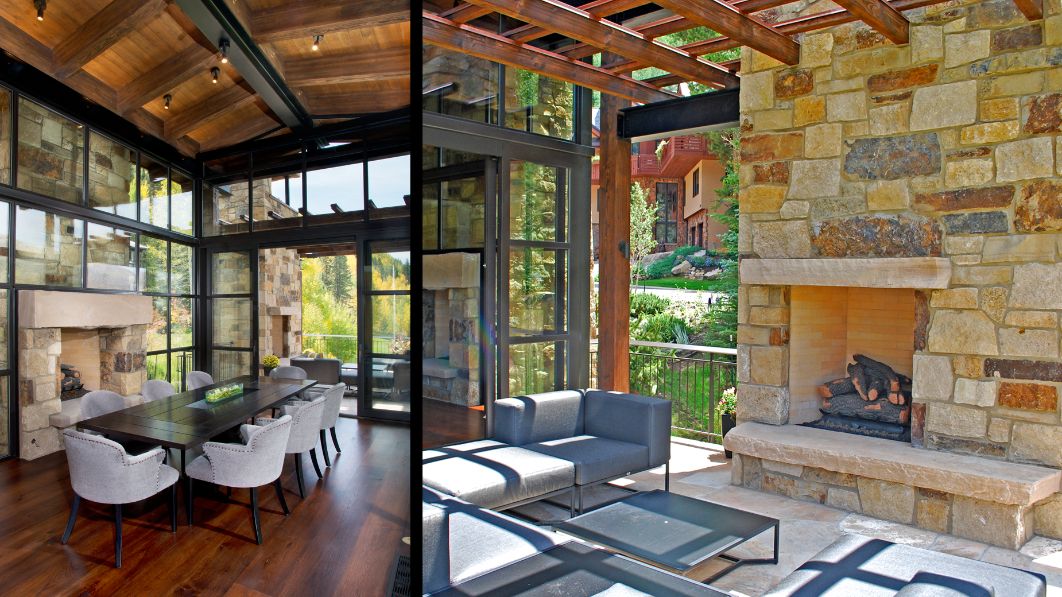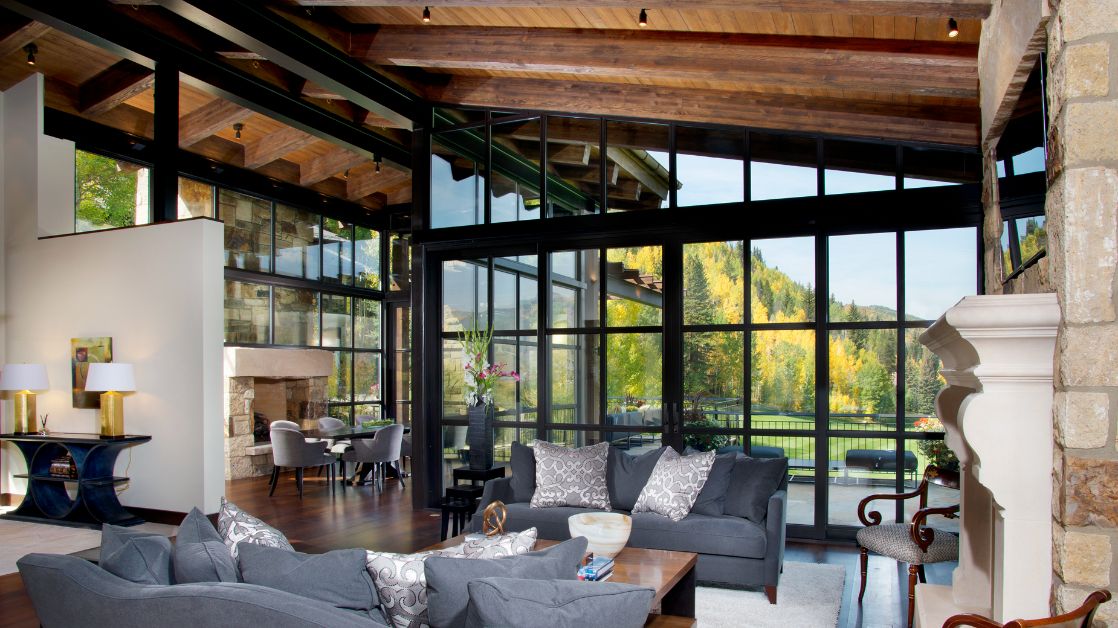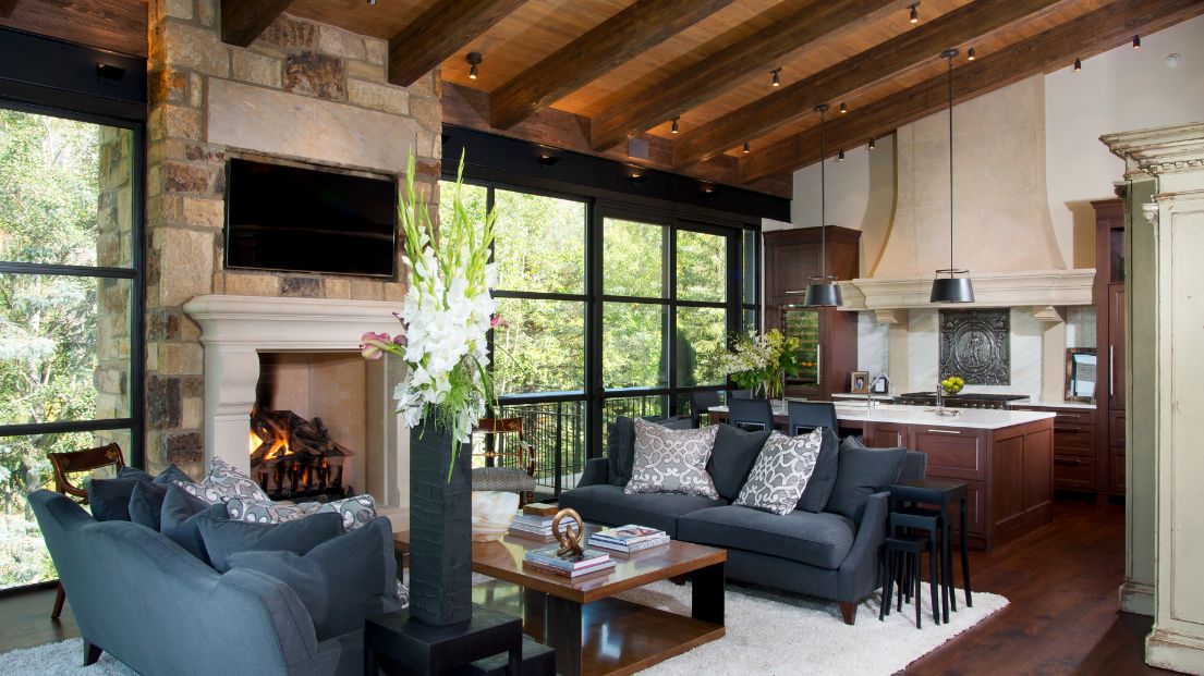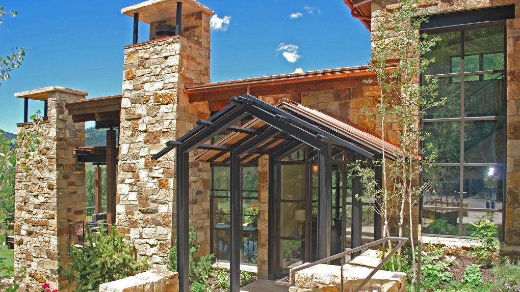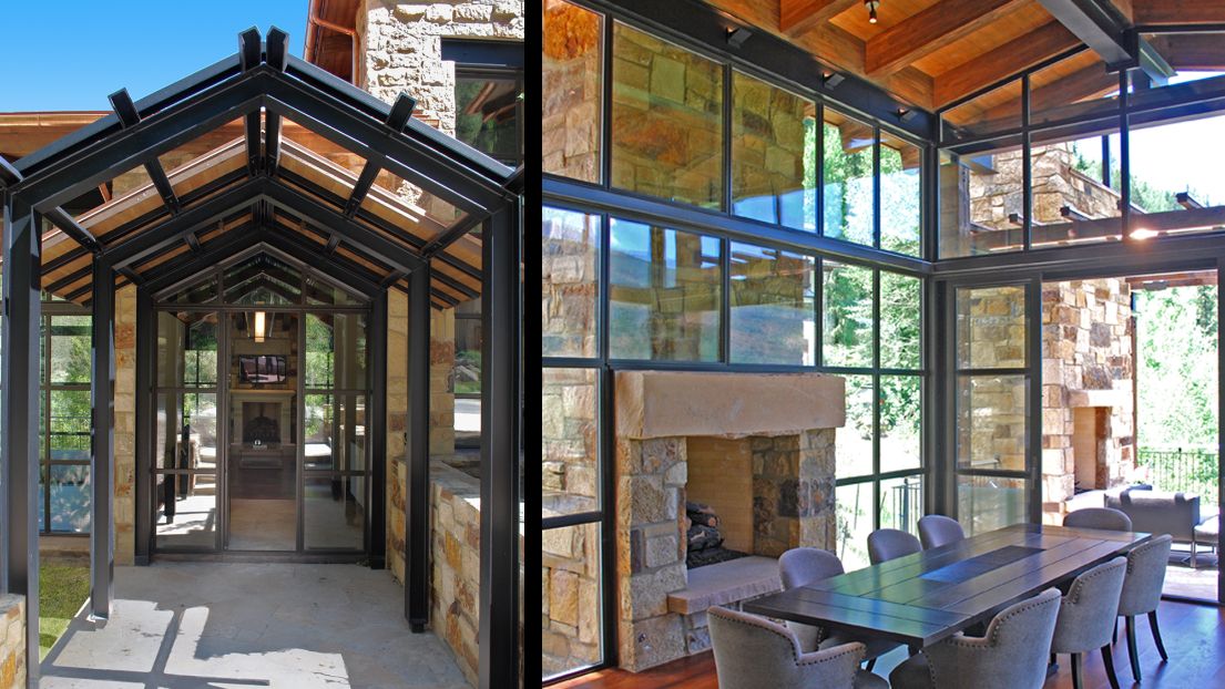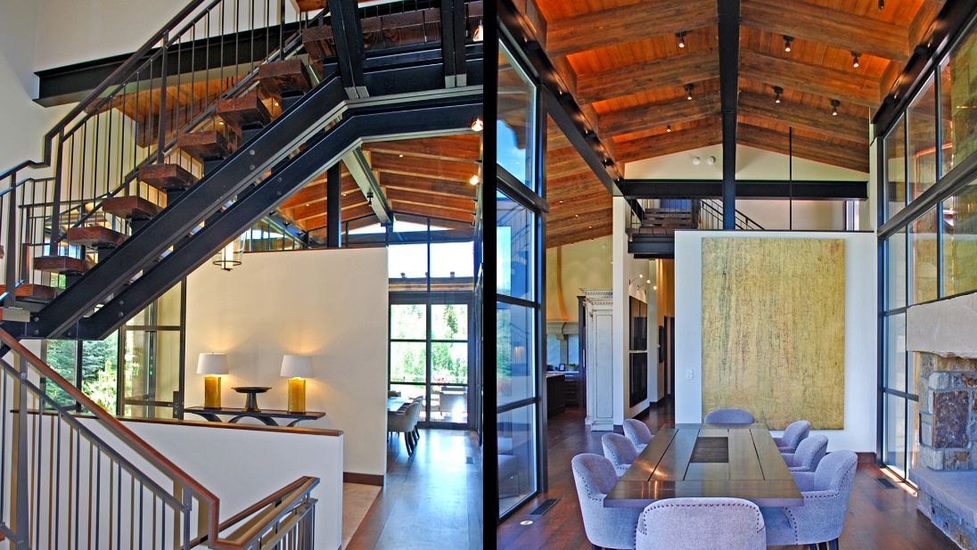 When planning the home, the owners said “We want to stand in the middle of the house and have the view come to us… and we want it to be a timeless modern old world home.” We achieved this through a transparent steel structure with custom floor to ceiling steel windows throughout the great room which is balanced by old world stone fireplaces and the palette of rich natural materials of the organic hickory floors; the rustic wood beams and ceilings; and the natural stained Alder casework and cabinets. The cleanly detailed exposed structural steel and steel railings are harmoniously juxtaposed by the natural materials utilized throughout the house creating a dynamic design which is at once modern and old world. Instead of hiding these necessary structural steel elements, we have used them as powerful design elements which accentuate the old world nature of the stone and organic palette of the natural materials.