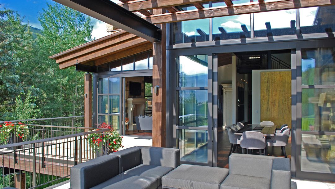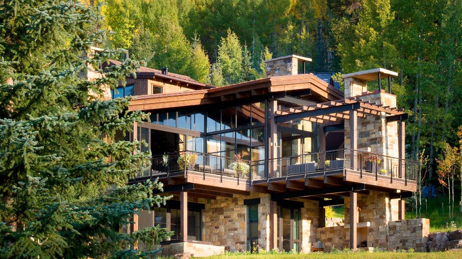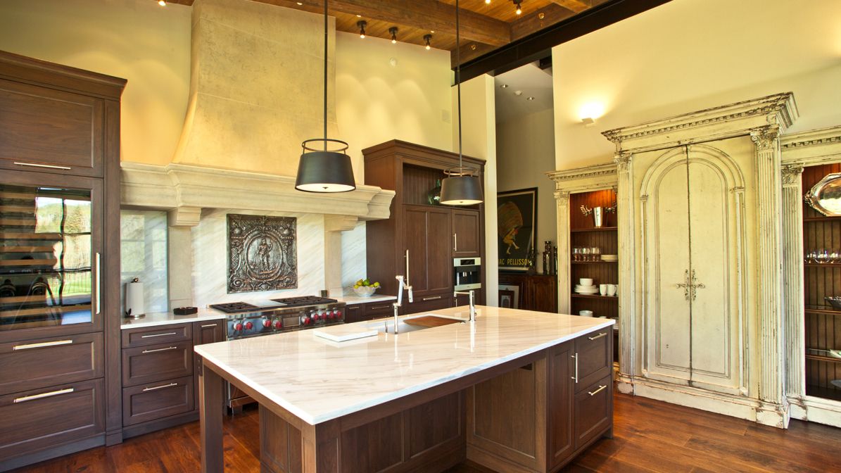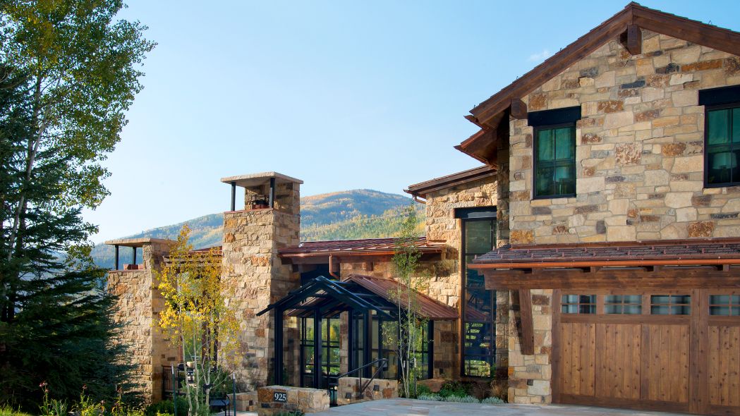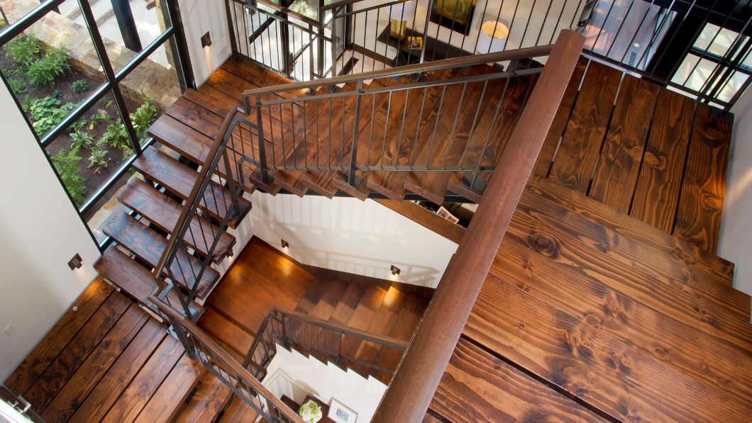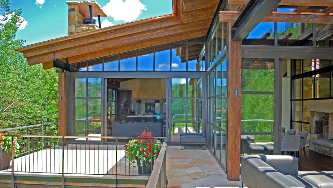 When planning the home, the owners said “We want to stand in the middle of the house and have the view come to us… and we want it to be a timeless modern old world home.” We achieved this through a transparent steel structure with custom floor to ceiling steel windows throughout the great room which is balanced by old world stone fireplaces and the palette of rich natural materials of the organic hickory floors; the rustic wood beams and ceilings; and the natural stained Alder casework and cabinets. The cleanly detailed exposed structural steel and steel railings are harmoniously juxtaposed by the natural materials utilized throughout the house creating a dynamic design which is at once modern and old world. Instead of hiding these necessary structural steel elements, we have used them as powerful design elements which accentuate the old world nature of the stone and organic palette of the natural materials.