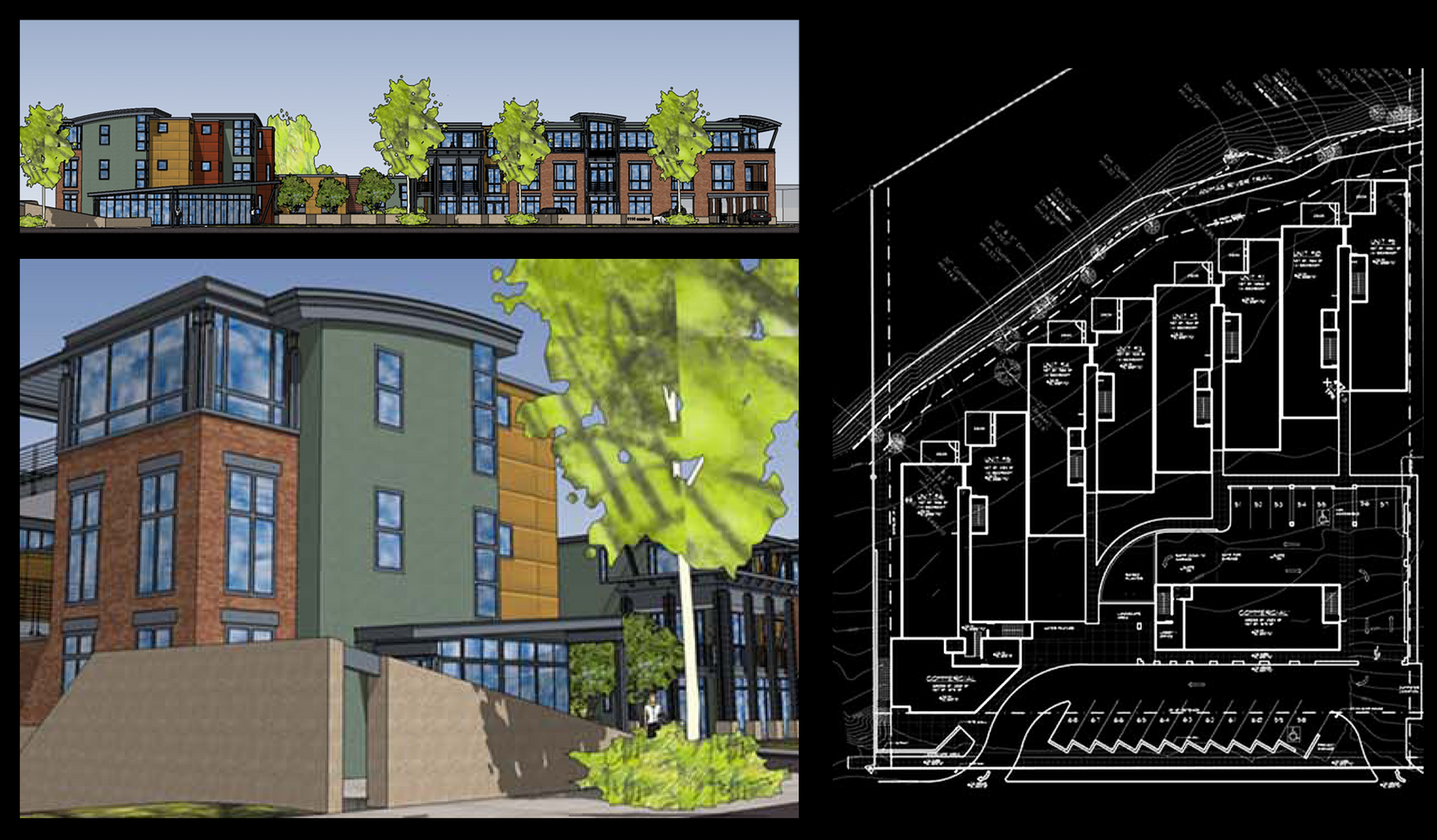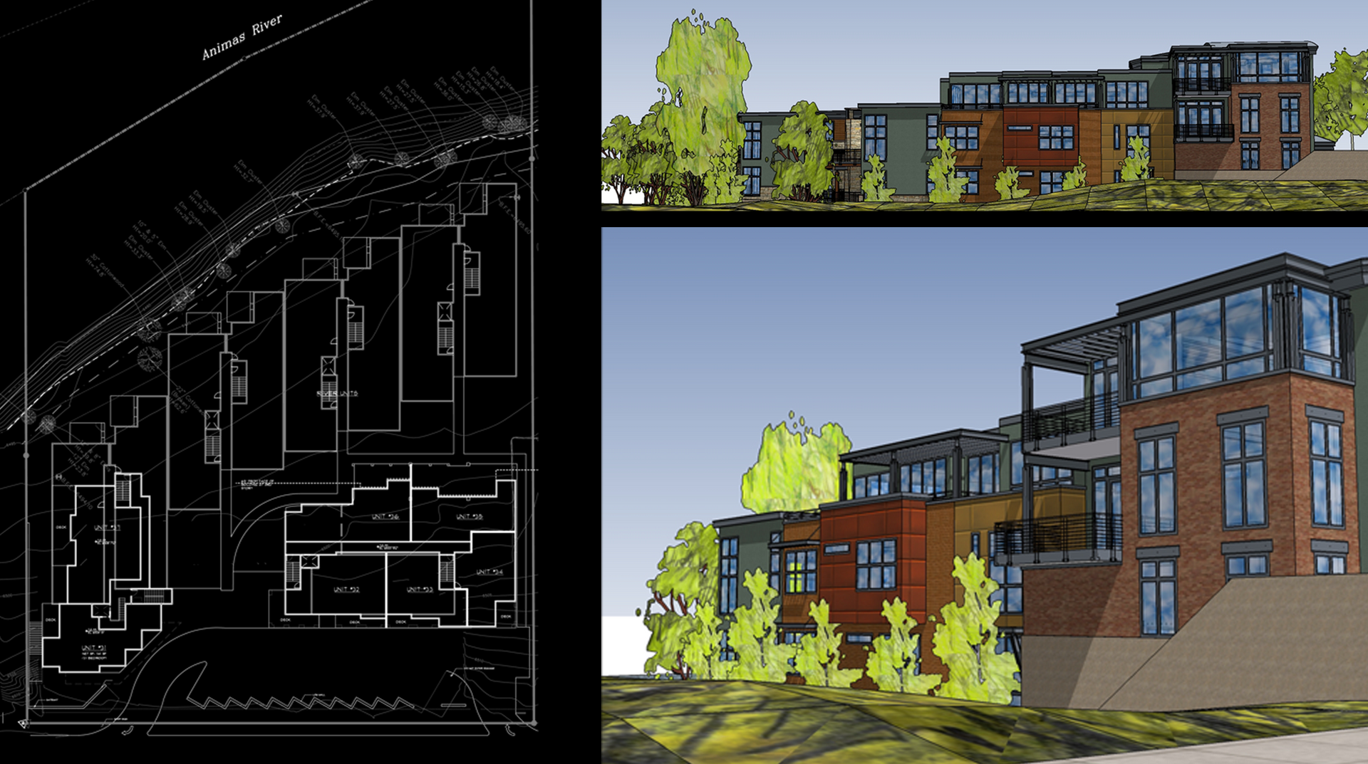 Berglund Architects master planned and designed this 38 unit, 80,000 SF redevelopment mixed use project on the Animas River in downtown Durango. The project includes street level surface commercial parking, private underground residential parking, 25 three-bedroom riverfront units and 13 smaller live-work units above street level commercial space. It incorporates access to a public river trail and a significant water feature linking a street level public patio with river level private interior landscaped courtyard. The contemporary contextual architecture relates to the nearby historic masonry downtown buildings while creating a dynamic river corridor environment. Berglund Architects successfully led the planning approval process.