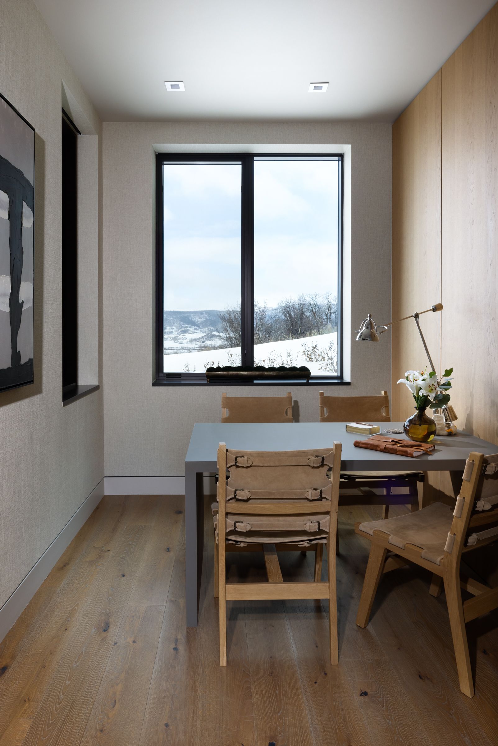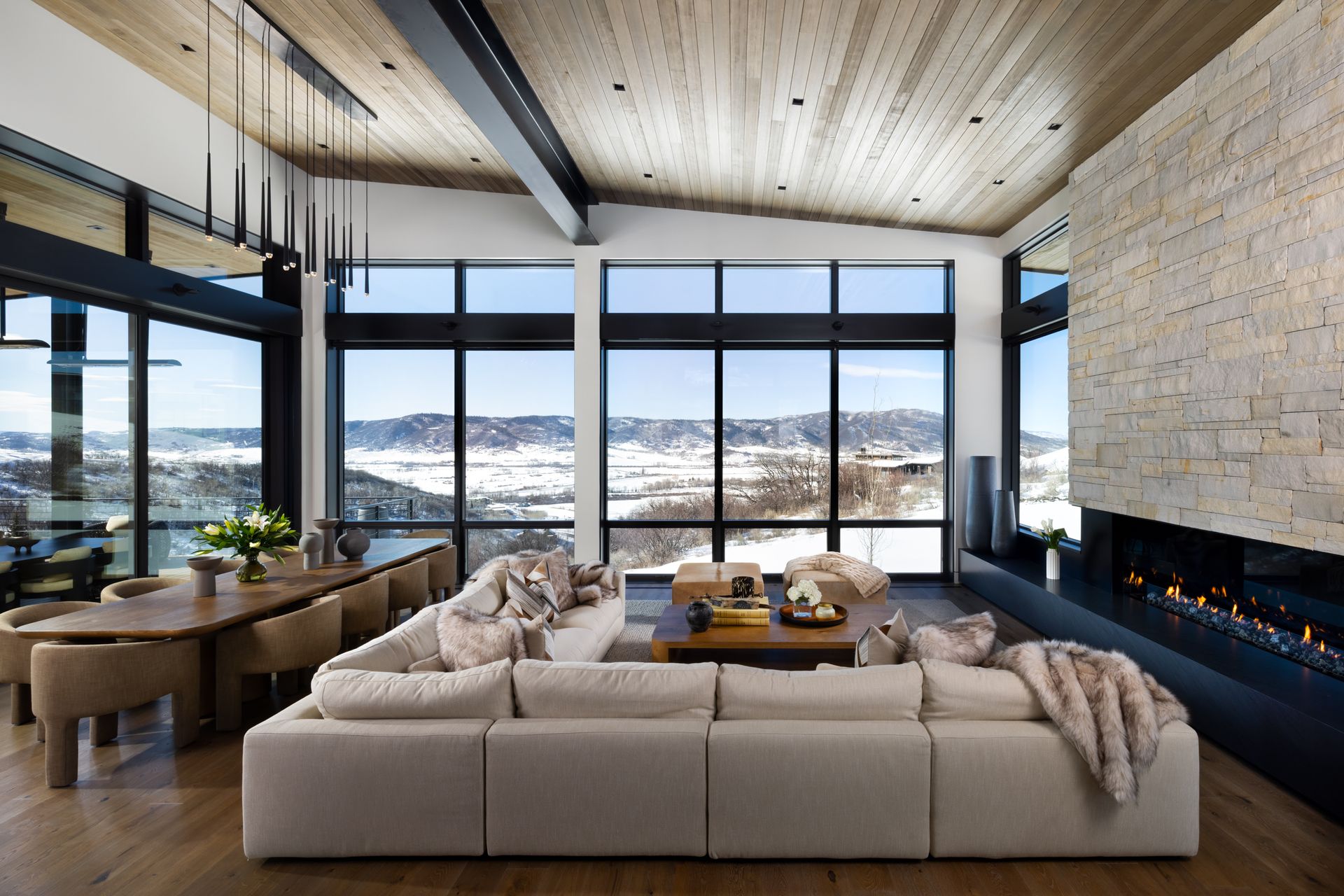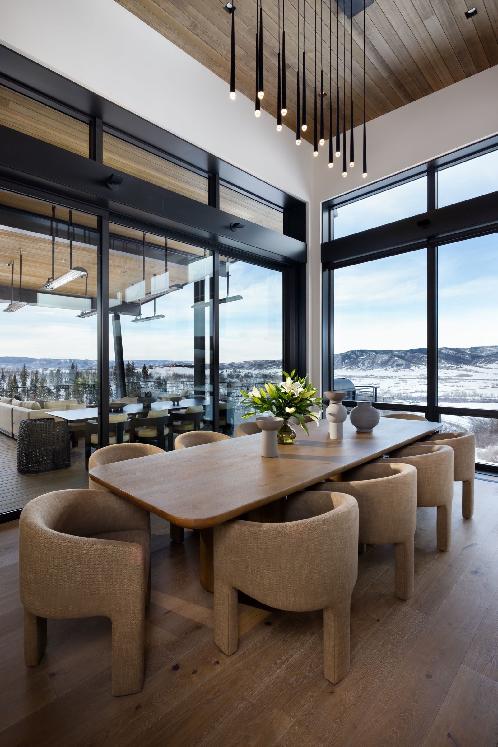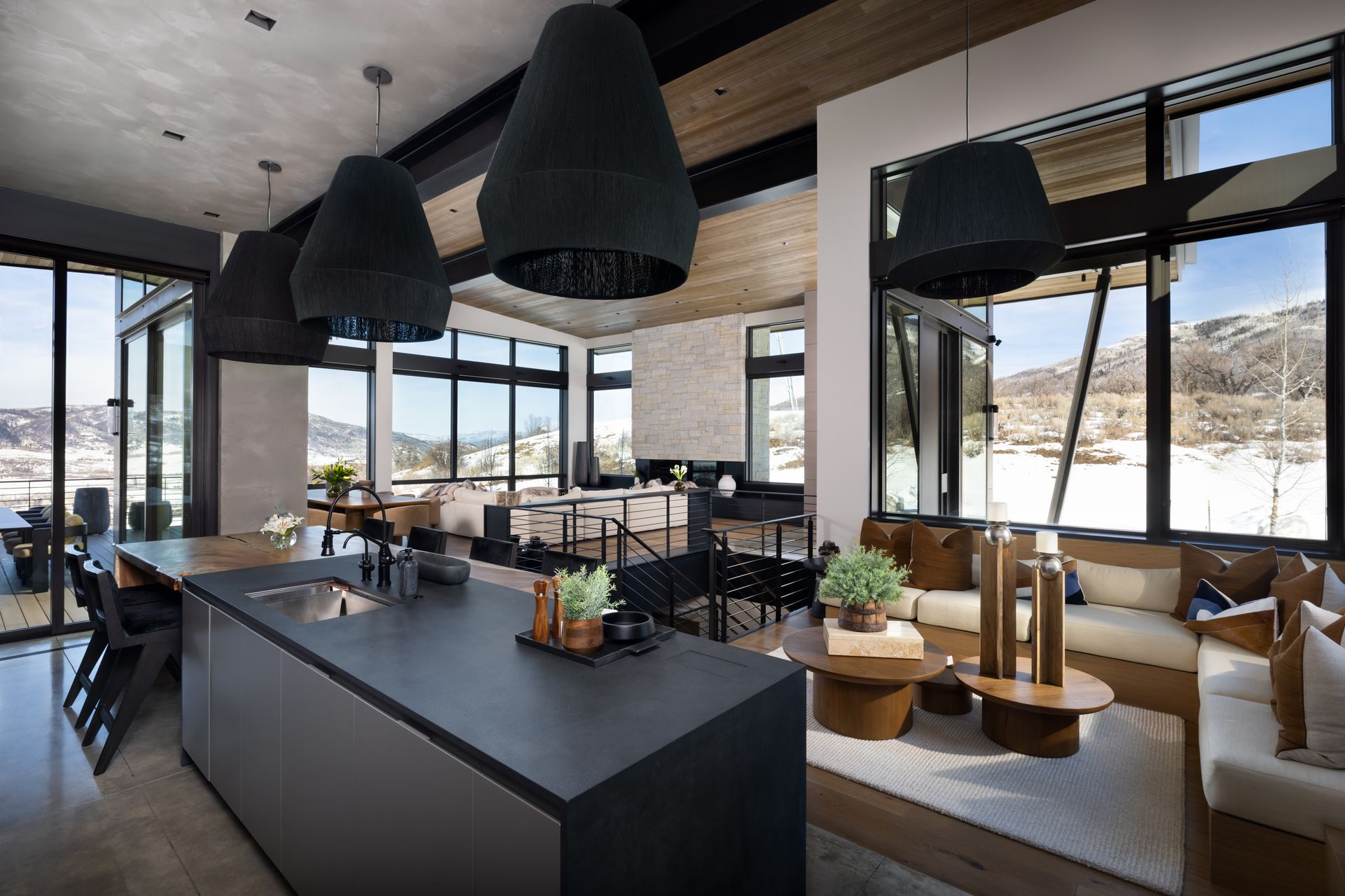 Inside, large windows frame the surrounding landscape from nearly every room. The living and dining areas look south to west toward the Flat Tops, while the kitchen and adjacent lounging nook are oriented toward Steamboat Ski Resort with views of the ski mountain and gondola.