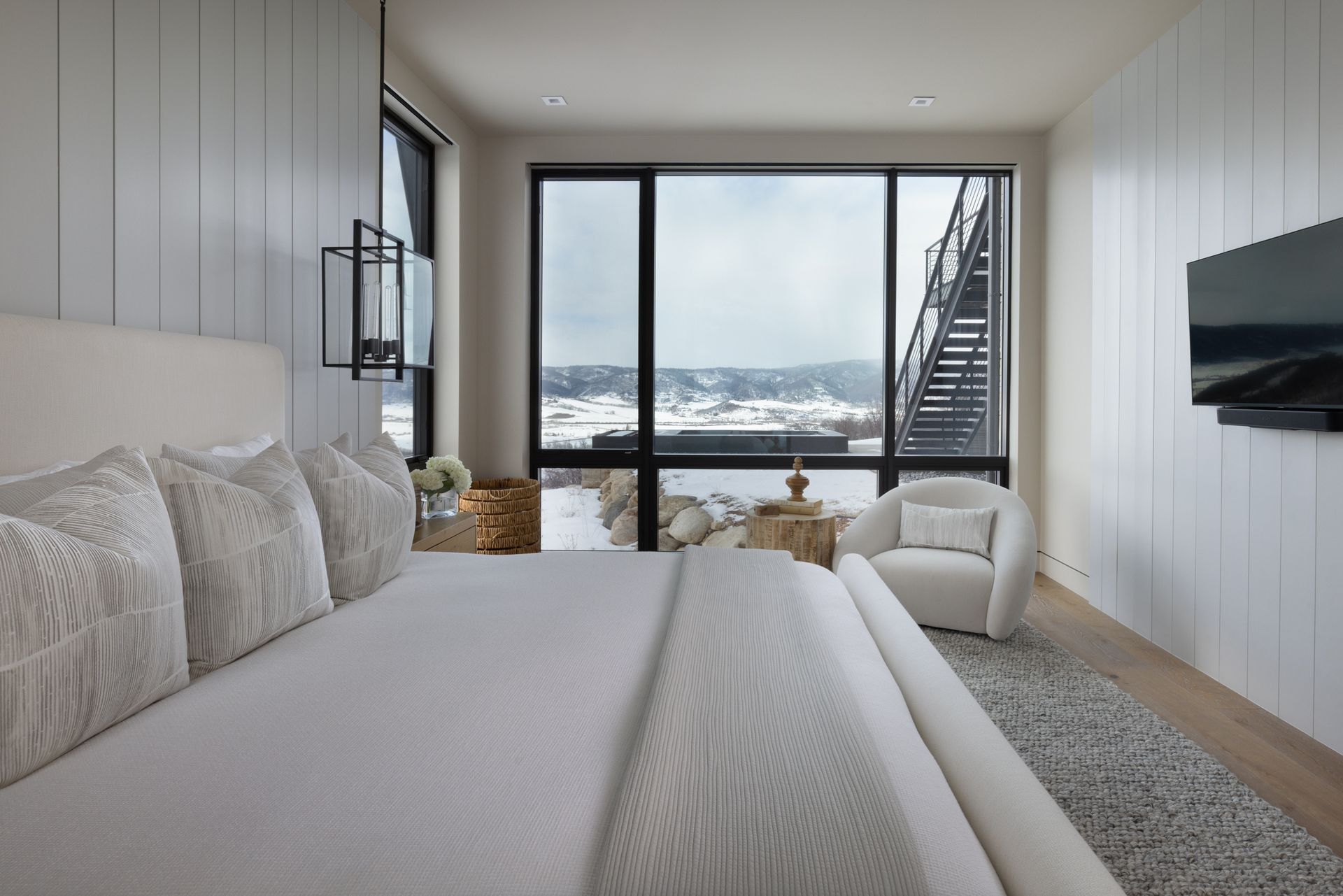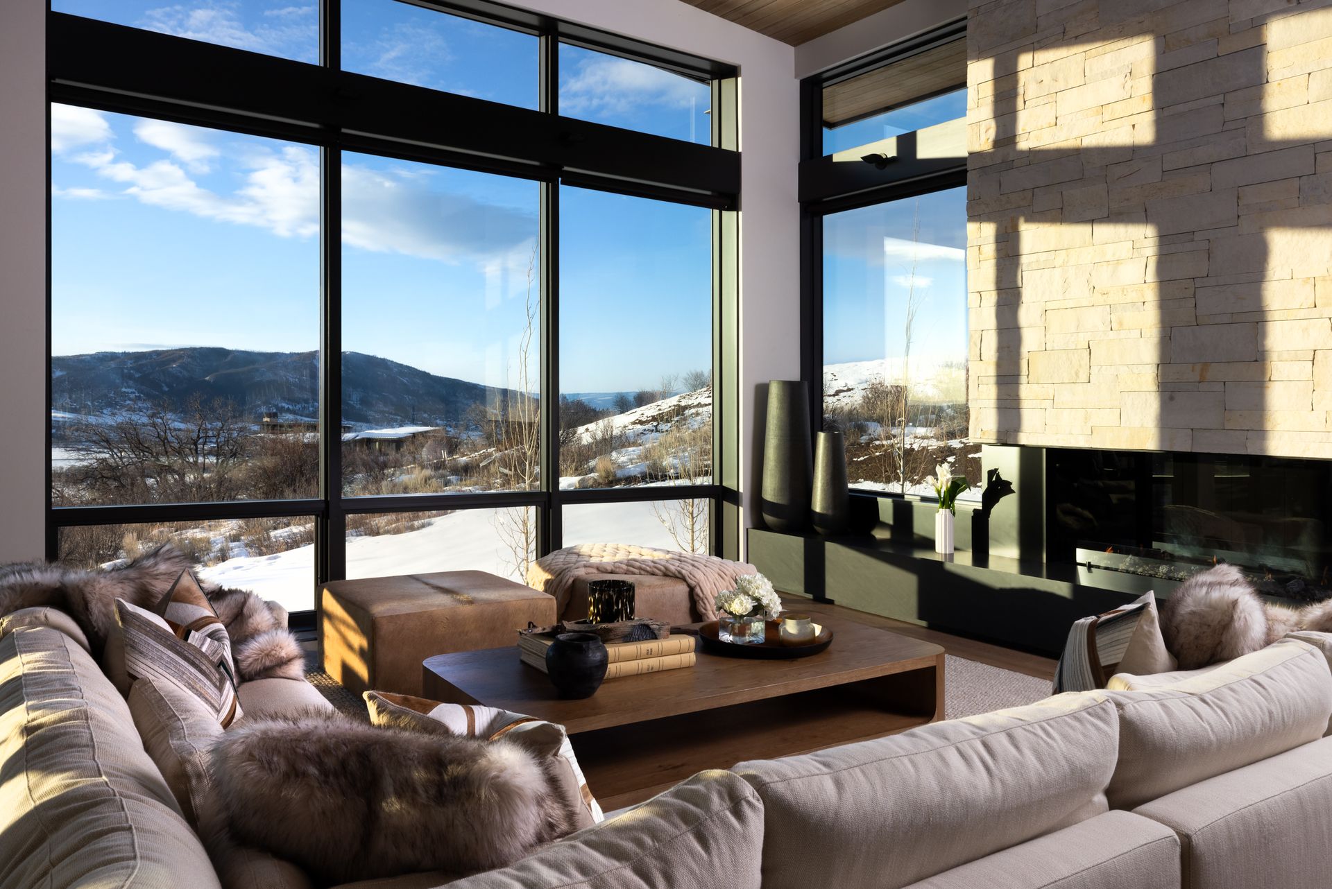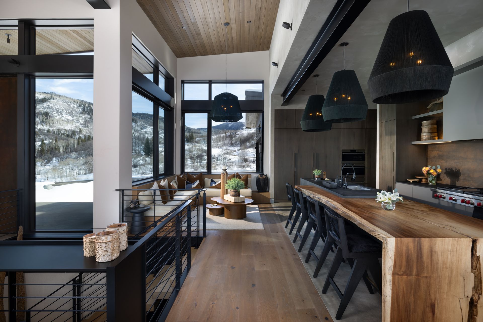 Inside, large windows frame the surrounding landscape from nearly every room. The living and dining areas look south to west toward the Flat Tops, while the kitchen and adjacent lounging nook are oriented toward Steamboat Ski Resort with views of the ski mountain and gondola.