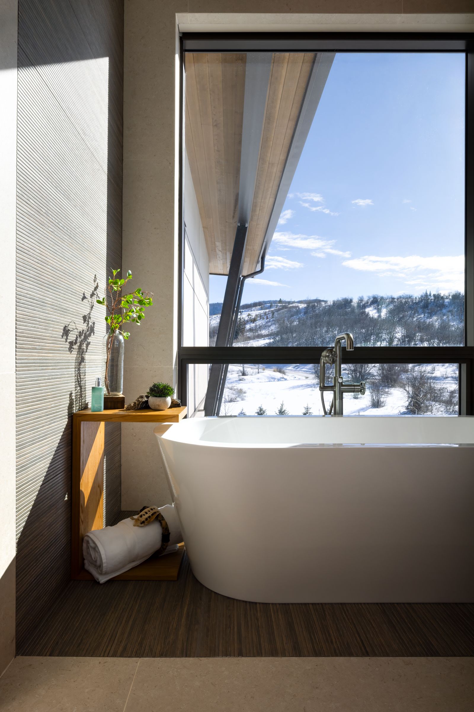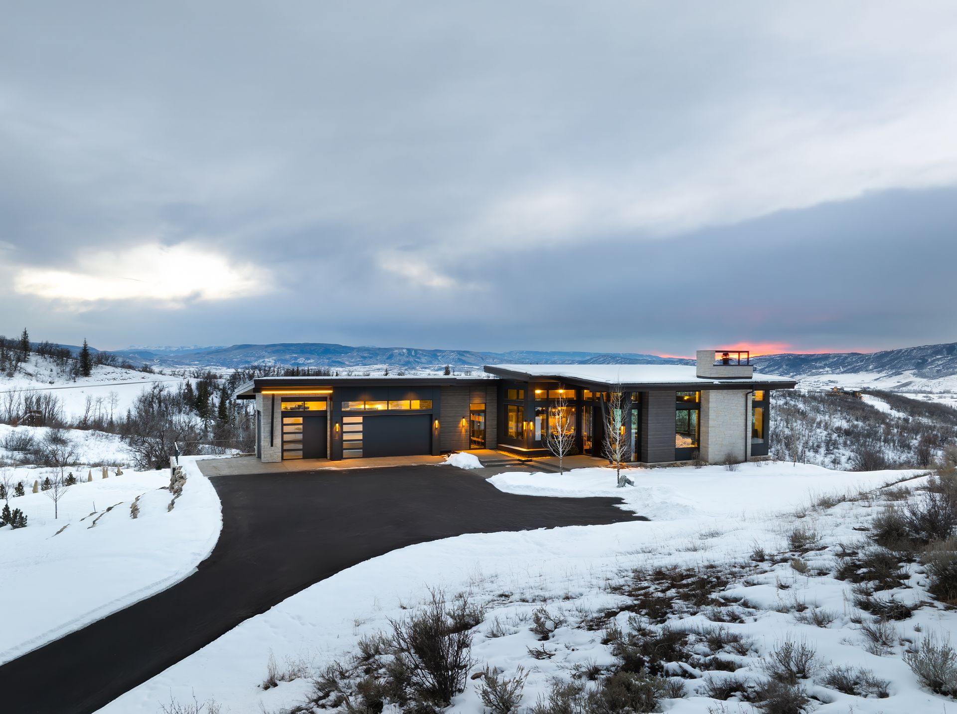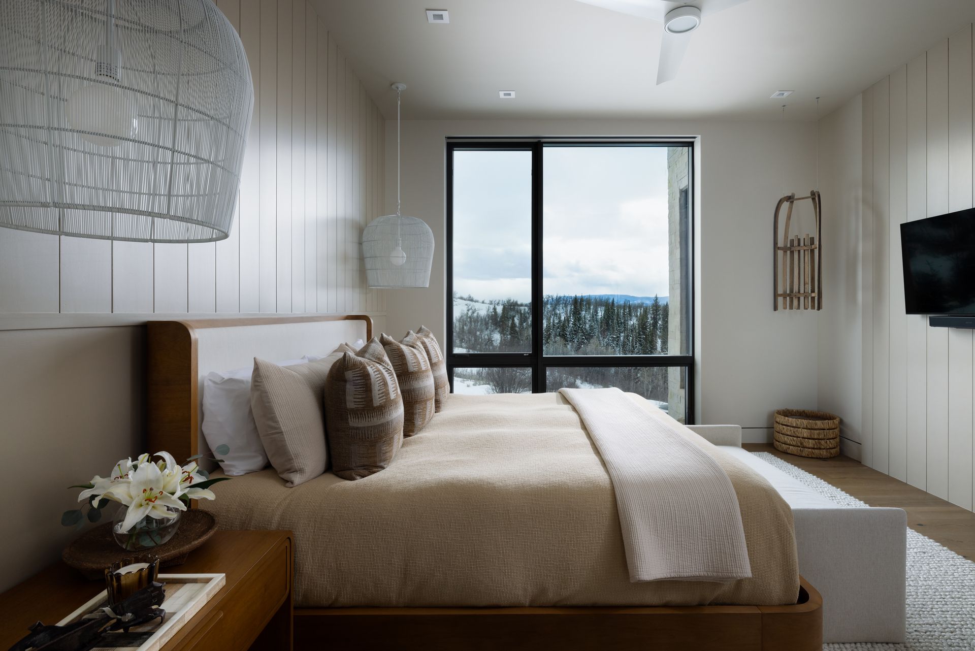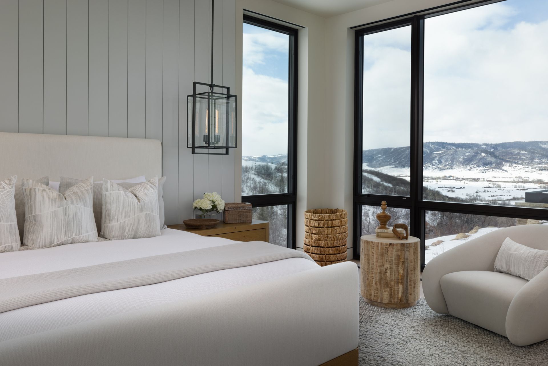 Inside, large windows frame the surrounding landscape from nearly every room. The living and dining areas look south to west toward the Flat Tops, while the kitchen and adjacent lounging nook are oriented toward Steamboat Ski Resort with views of the ski mountain and gondola.