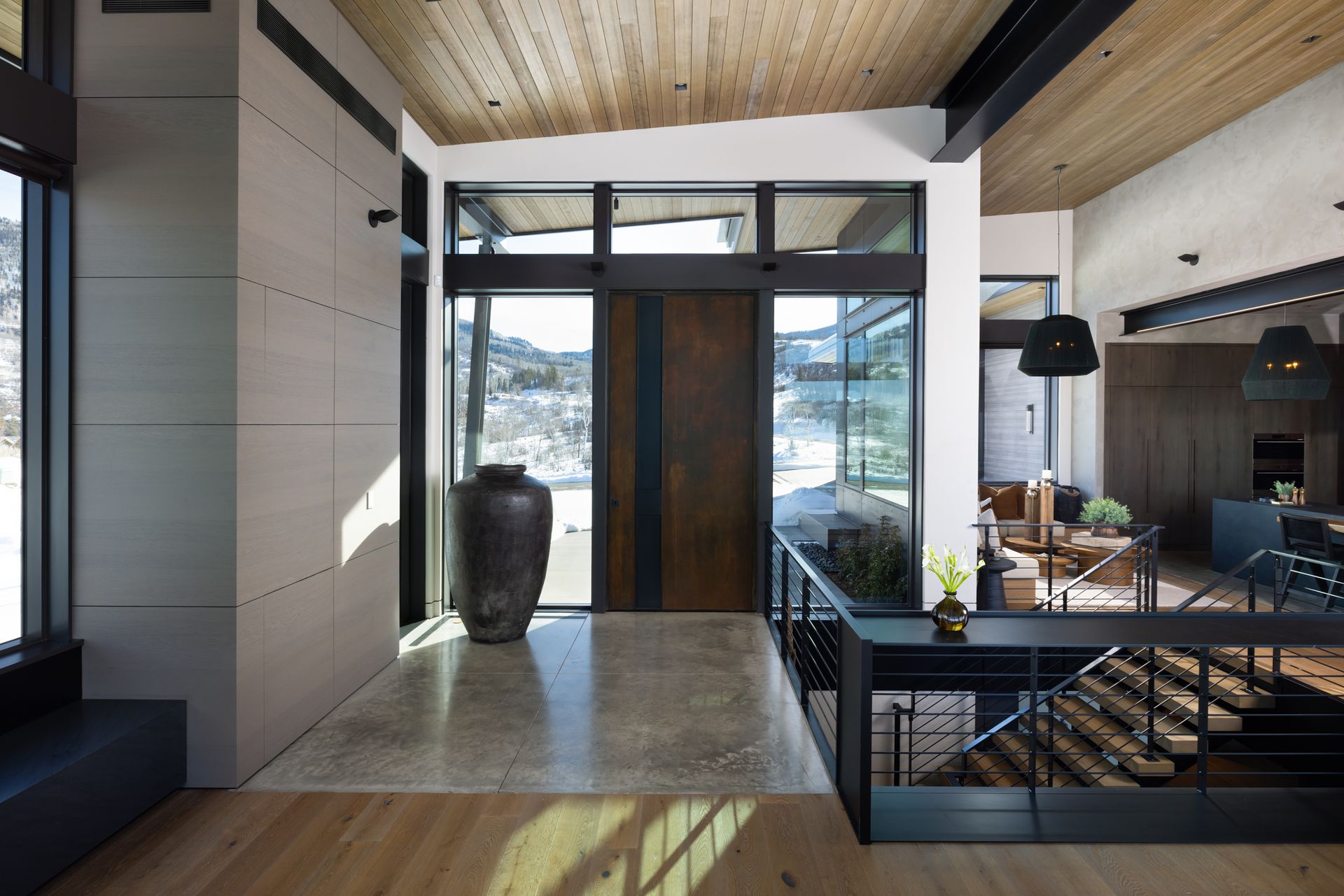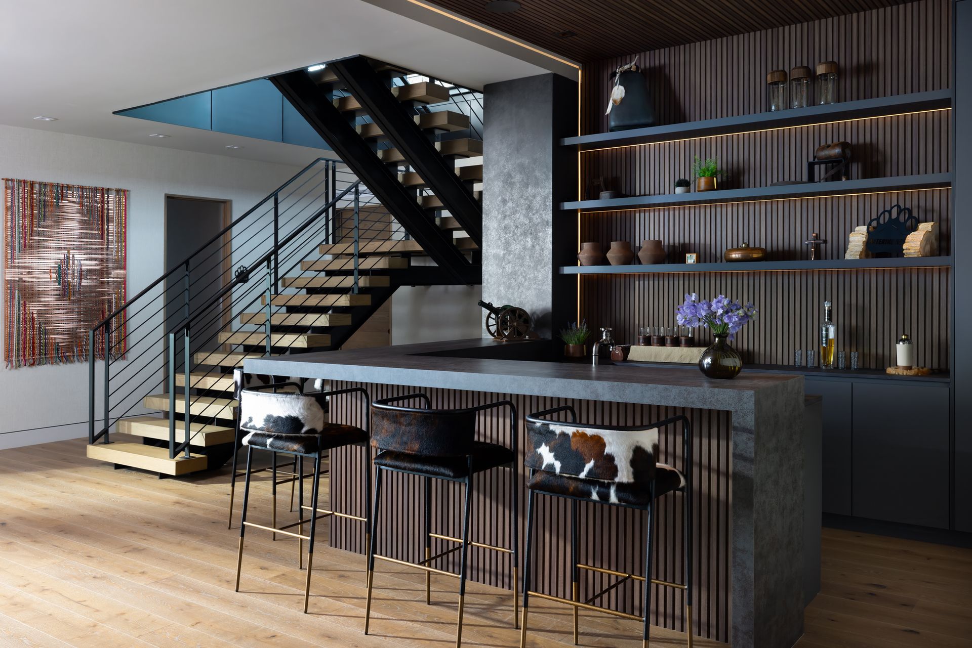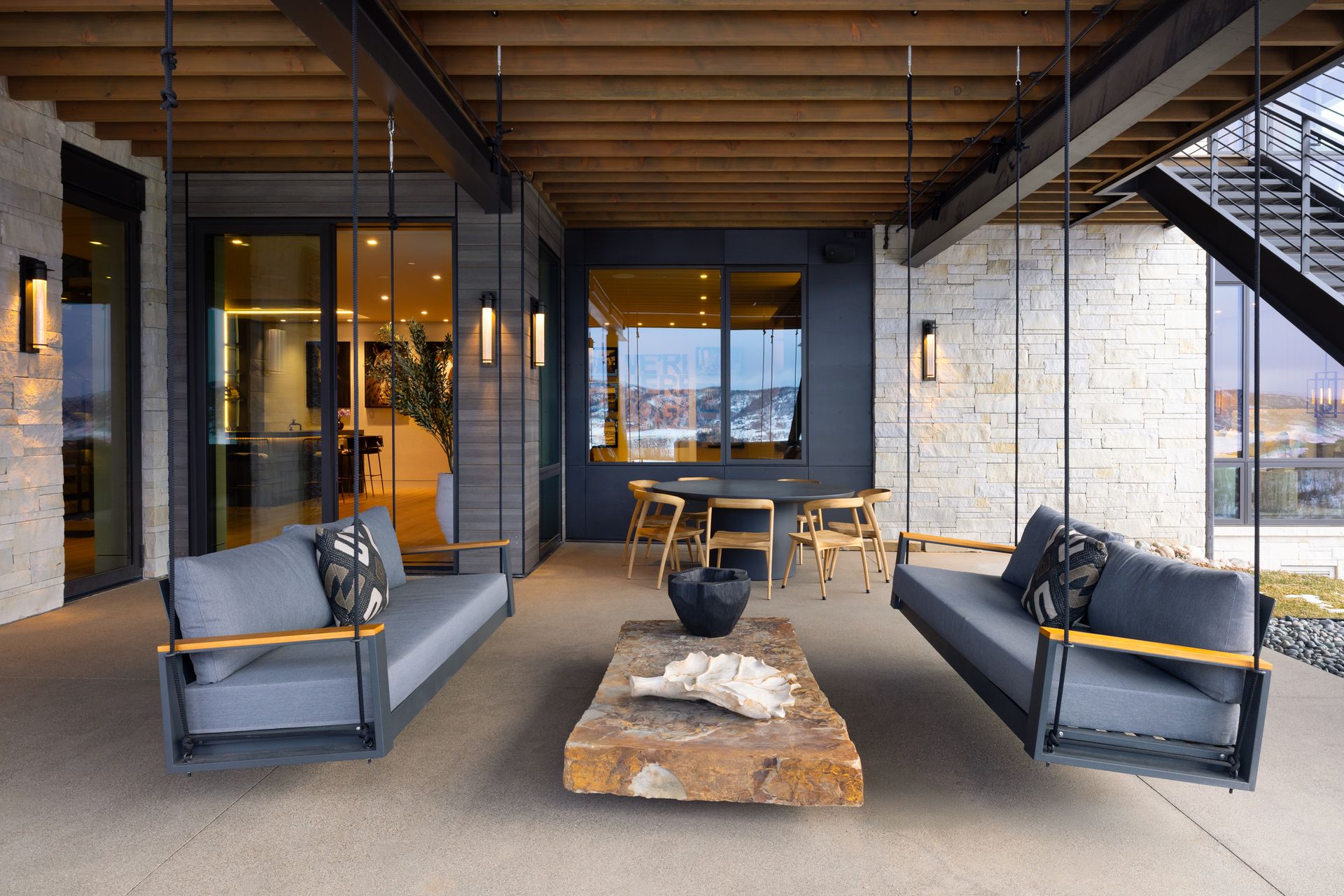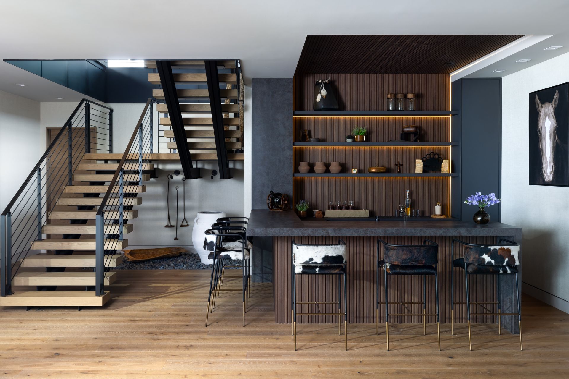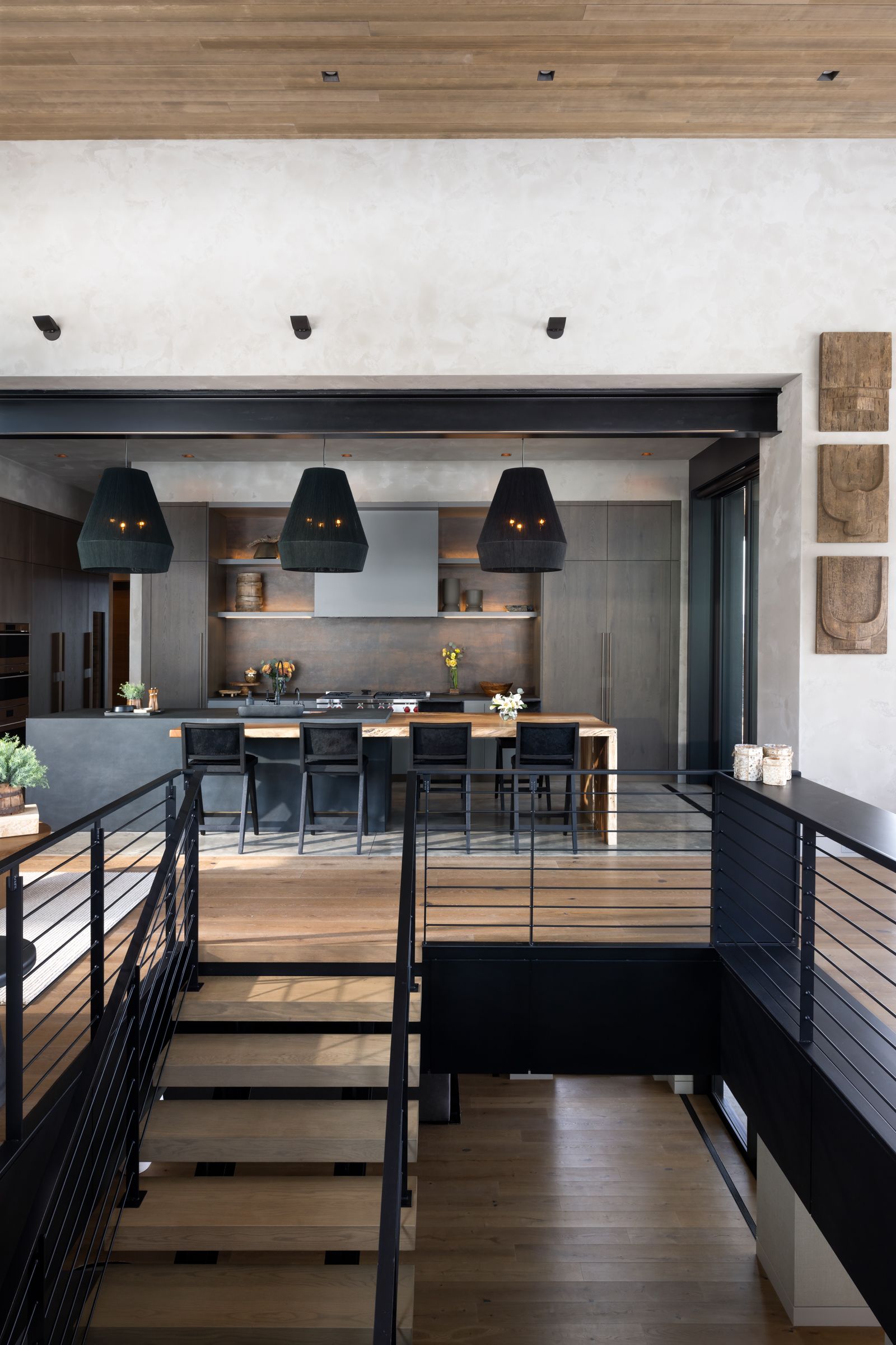 An open steel staircase connects the levels of the home, adding a sculptural focal point while reinforcing the openness of the interior spaces. Together, the home’s materials, views, and thoughtful layout create a welcoming mountain residence designed for gathering, connection, and enjoying the beauty of Steamboat in every season.