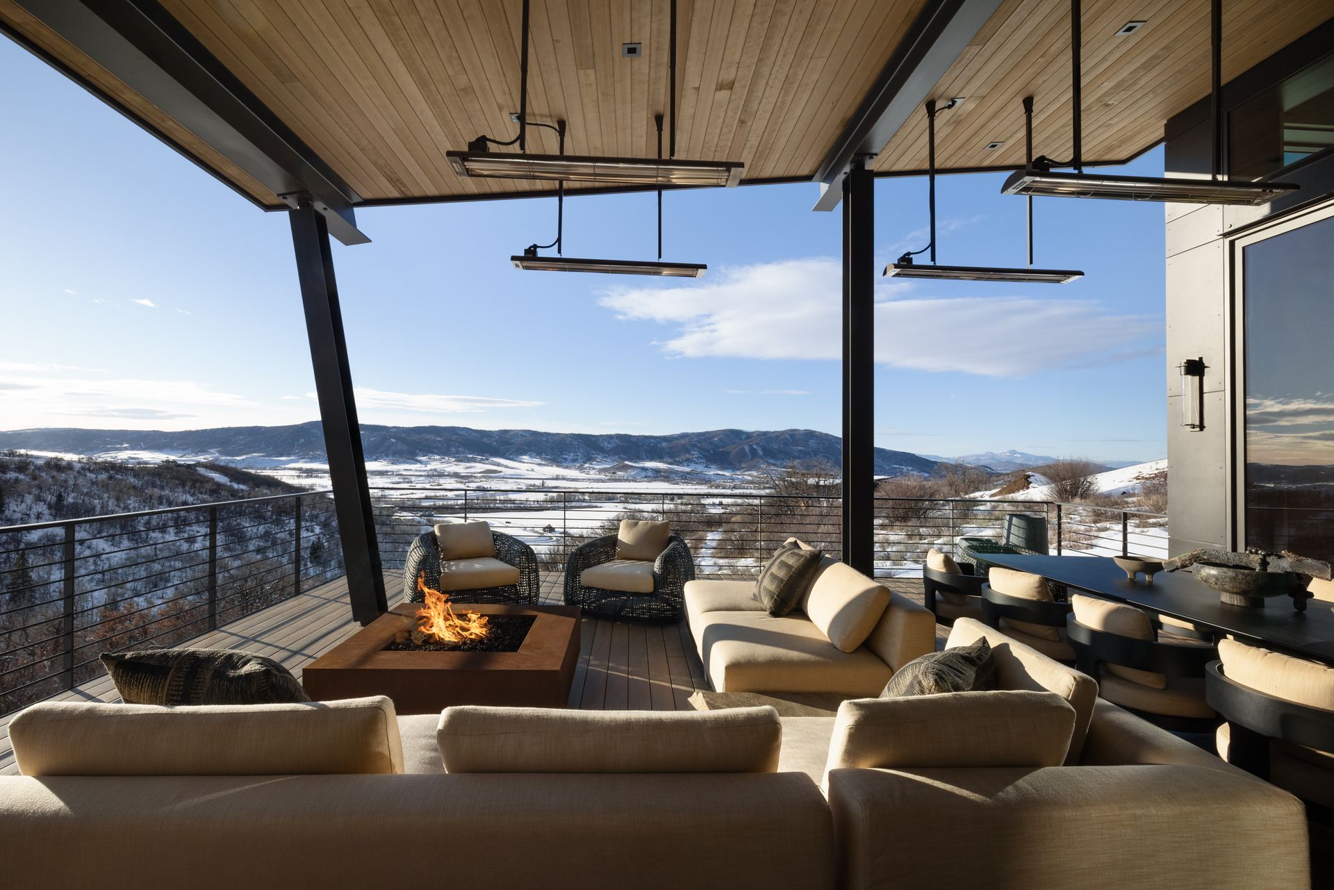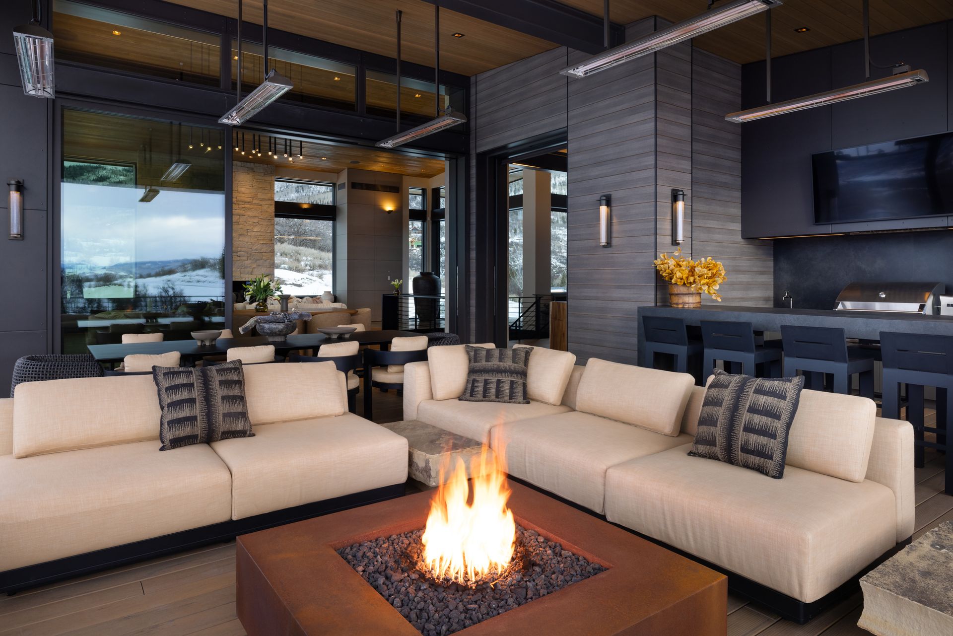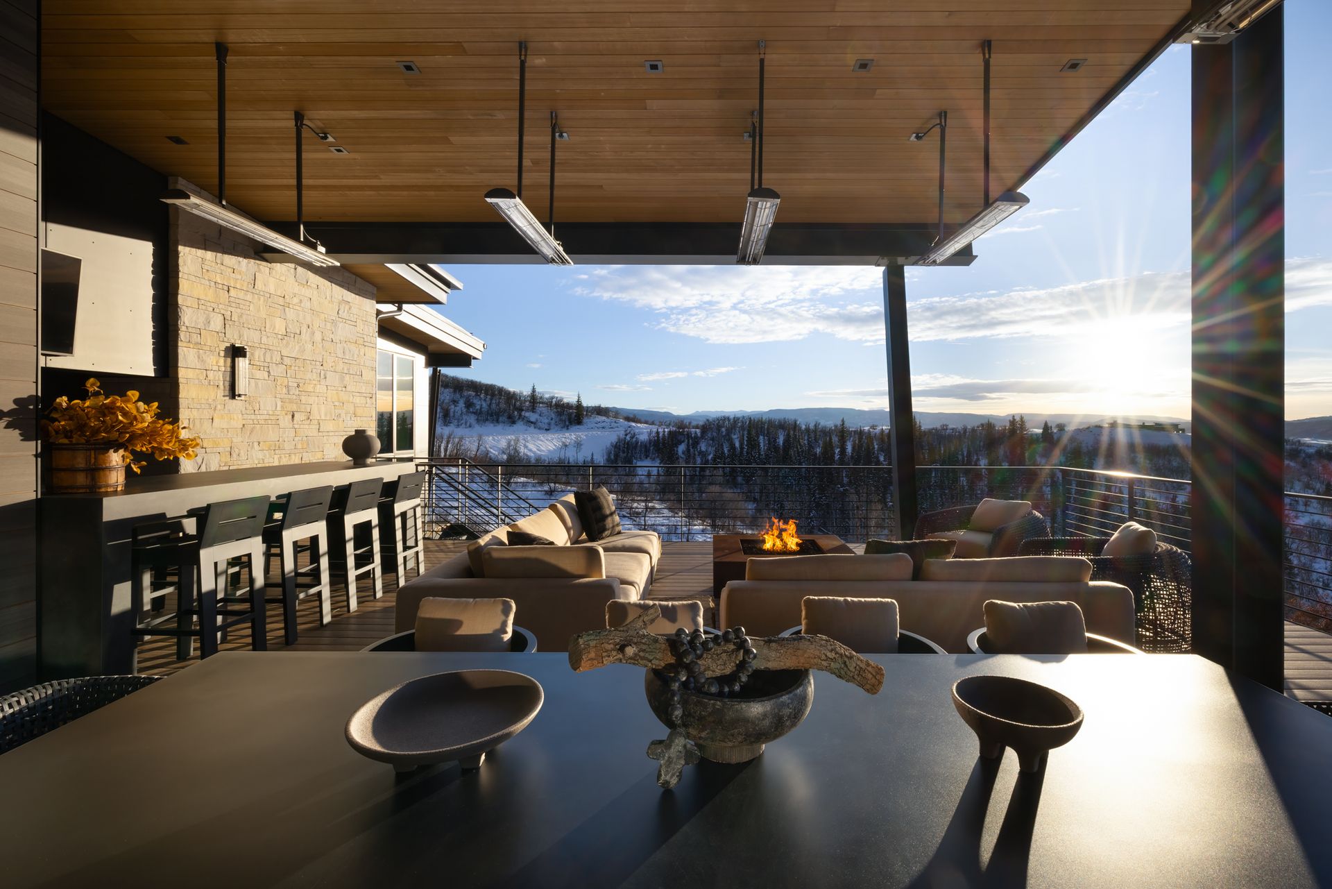 Outdoor living played a central role in the design process. In fact, the outdoor spaces were the first elements designed, with the home organized around them. The lower-level covered patio features firepit seating and a custom designed hot tub, creating a comfortable place to relax while taking in sweeping valley views. Above, a large sliding door extends the living space outdoors onto a covered deck with seating around a firepit, exterior dining with infrared heaters and an outdoor kitchen, making it ideal for gathering and entertaining throughout the year.