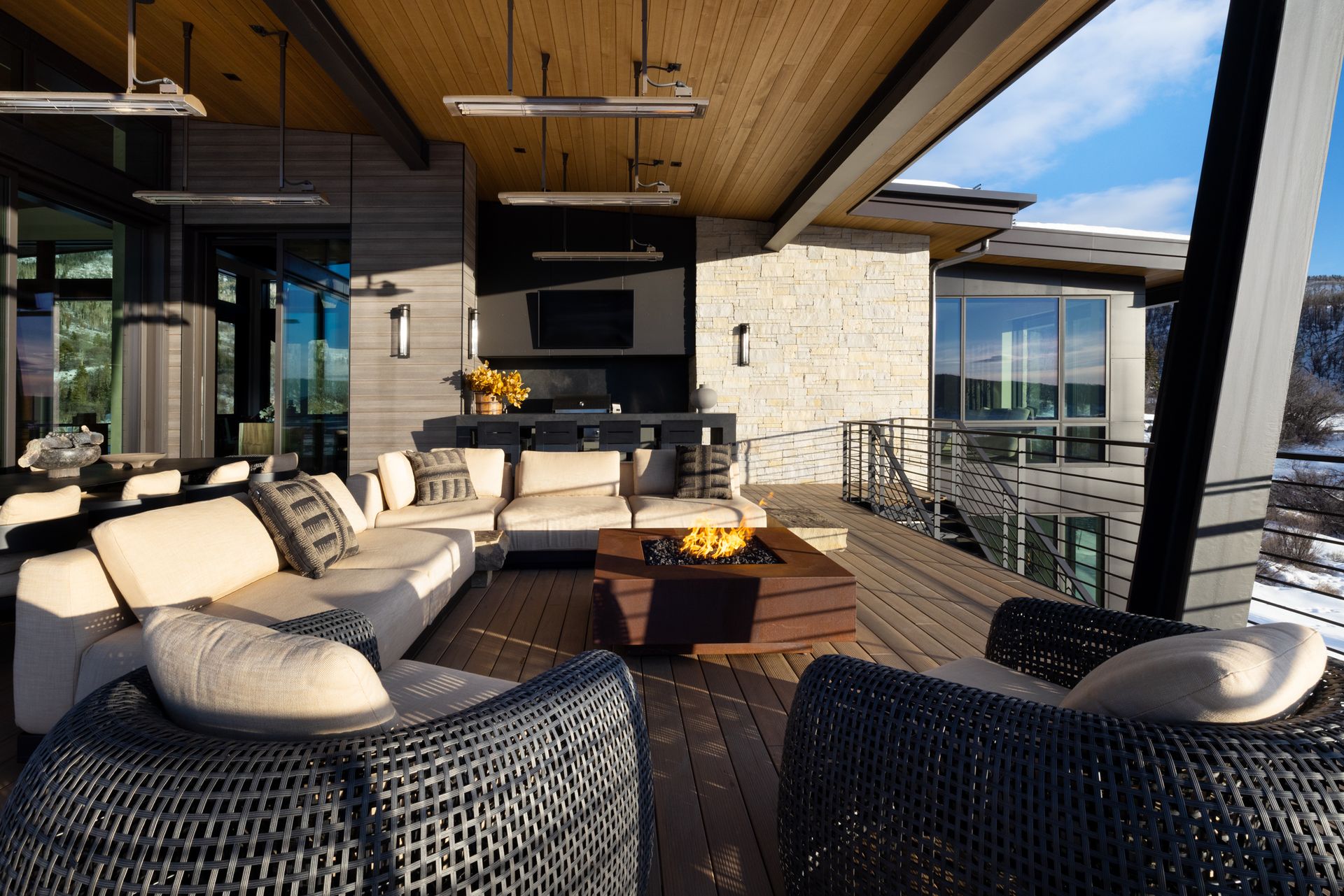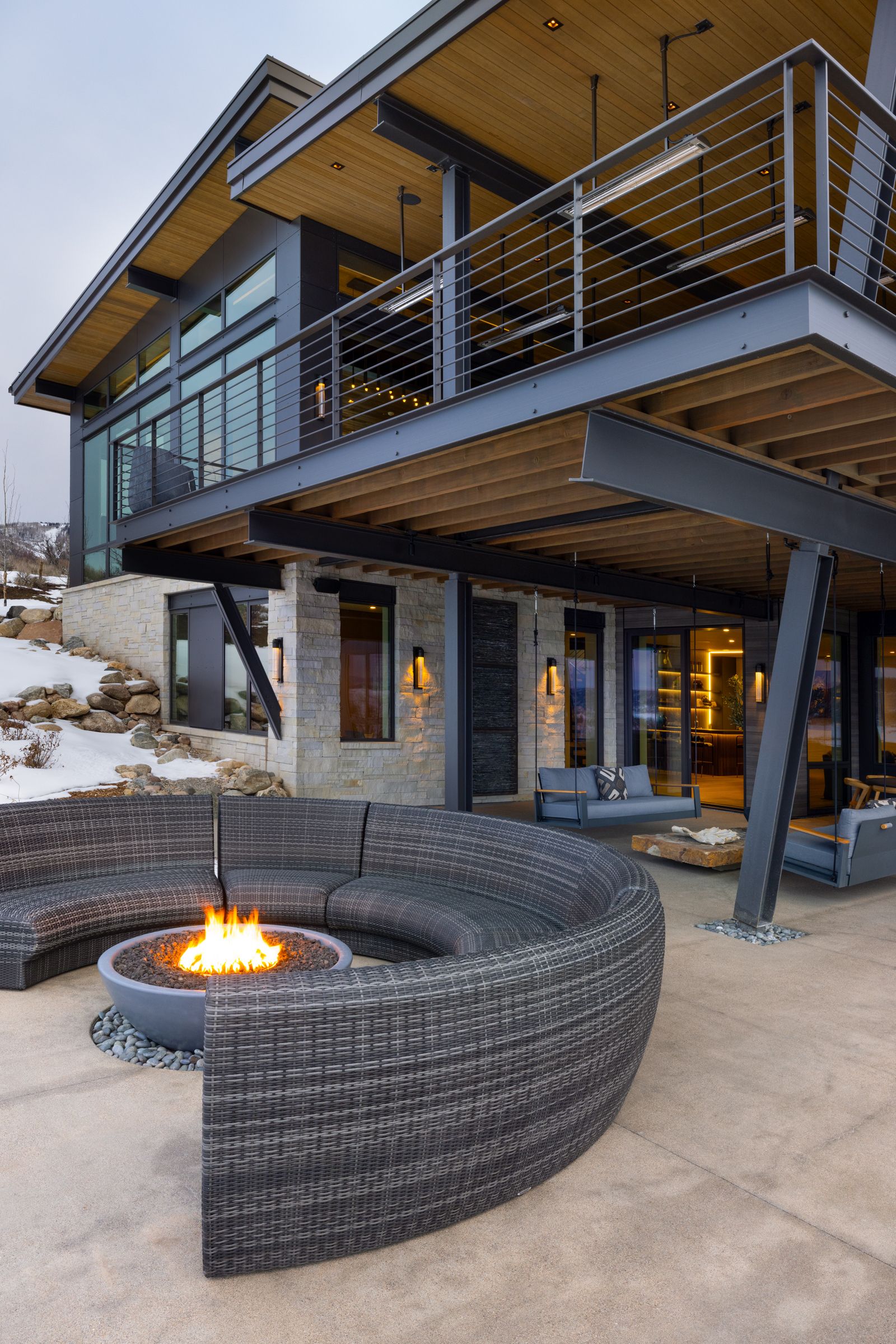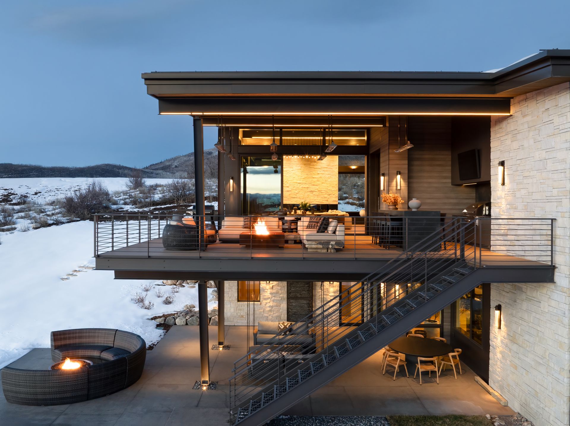 Outdoor living played a central role in the design process. In fact, the outdoor spaces were the first elements designed, with the home organized around them. The lower-level covered patio features firepit seating and a custom designed hot tub, creating a comfortable place to relax while taking in sweeping valley views. Above, a large sliding door extends the living space outdoors onto a covered deck with seating around a firepit, exterior dining with infrared heaters and an outdoor kitchen, making it ideal for gathering and entertaining throughout the year.