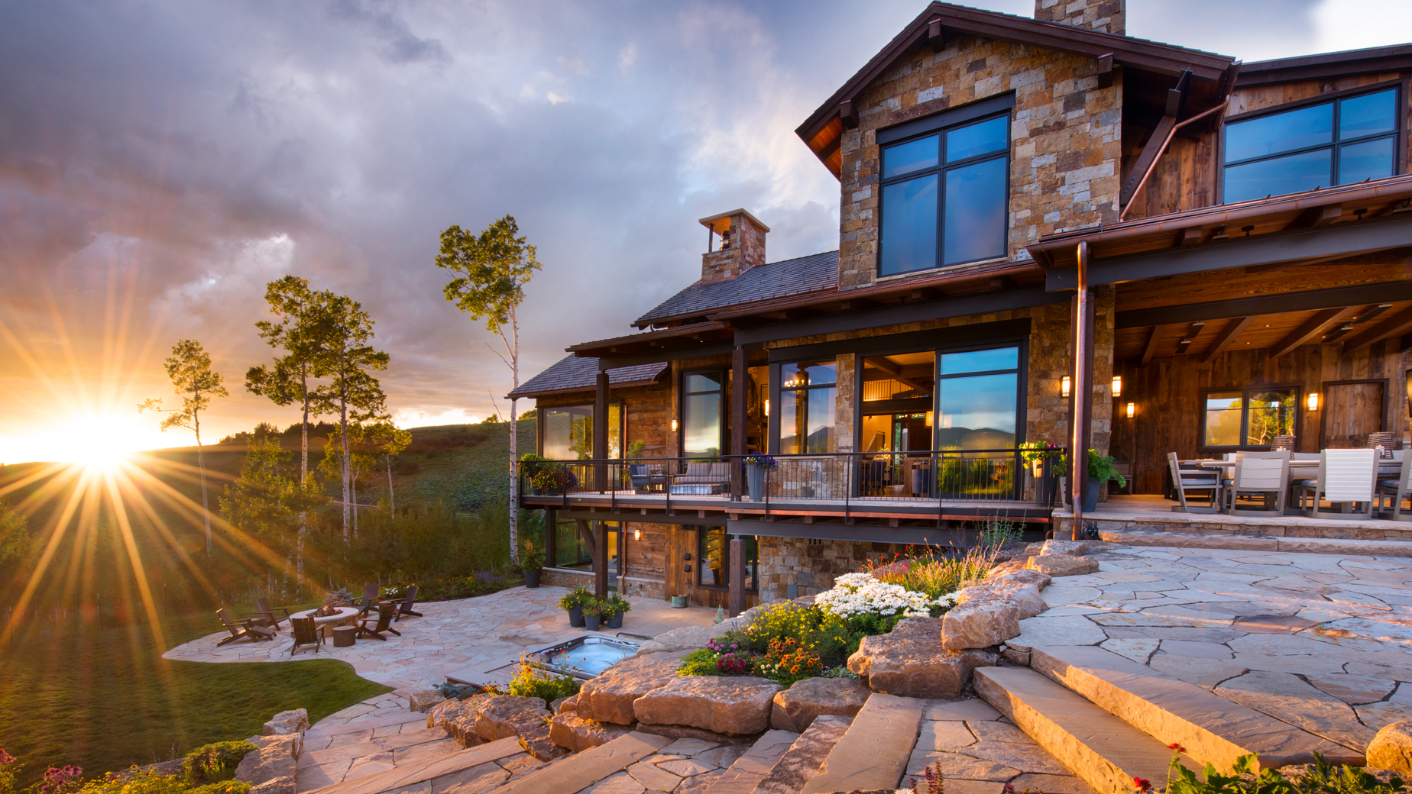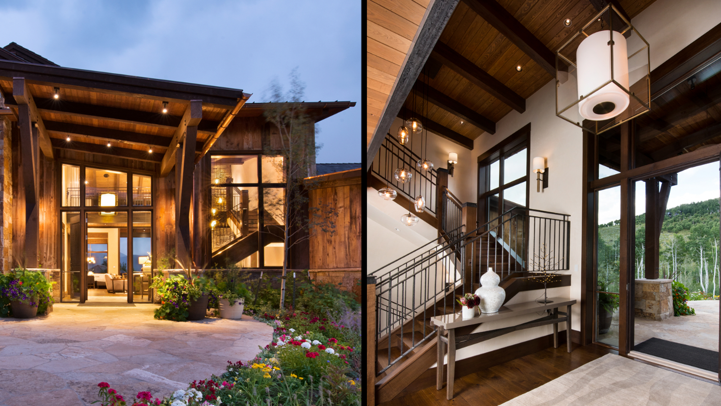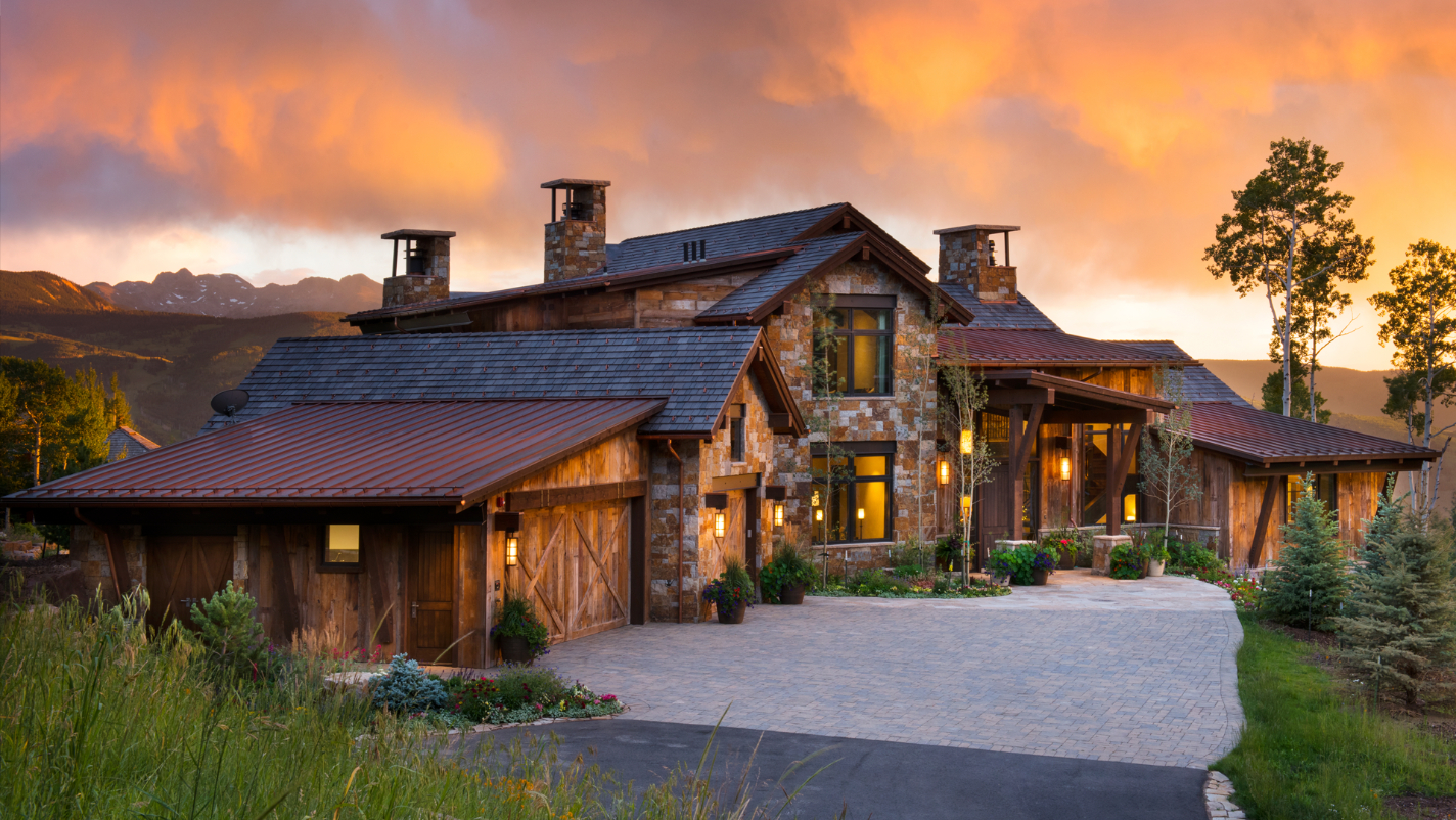 The architecture of this home consists of traditional vernacular gabled roof forms with cleanly detailed heavy timber roof rafters and shed roof elements supported by steel beams and wood struts, that, along with the steel railings and large windows, have a contemporary expression. The handsome exterior palette of natural materials include a warm toned dry-stack stone veneer base, Colorado Buff flagstone patios and walkways around the house, a combination of rich weathered brown toned reclaimed siding and a copper roof, gutters and downspouts.