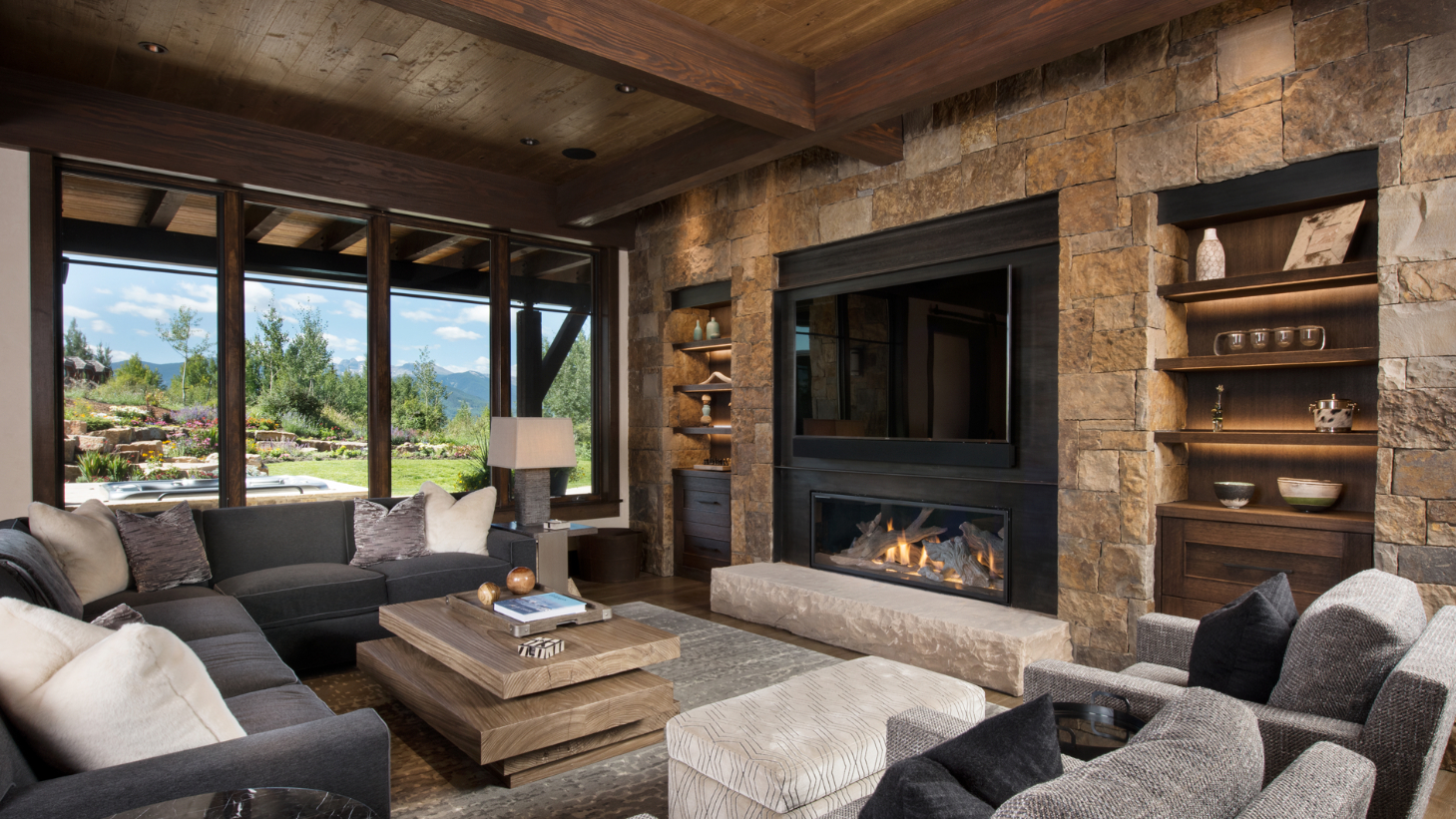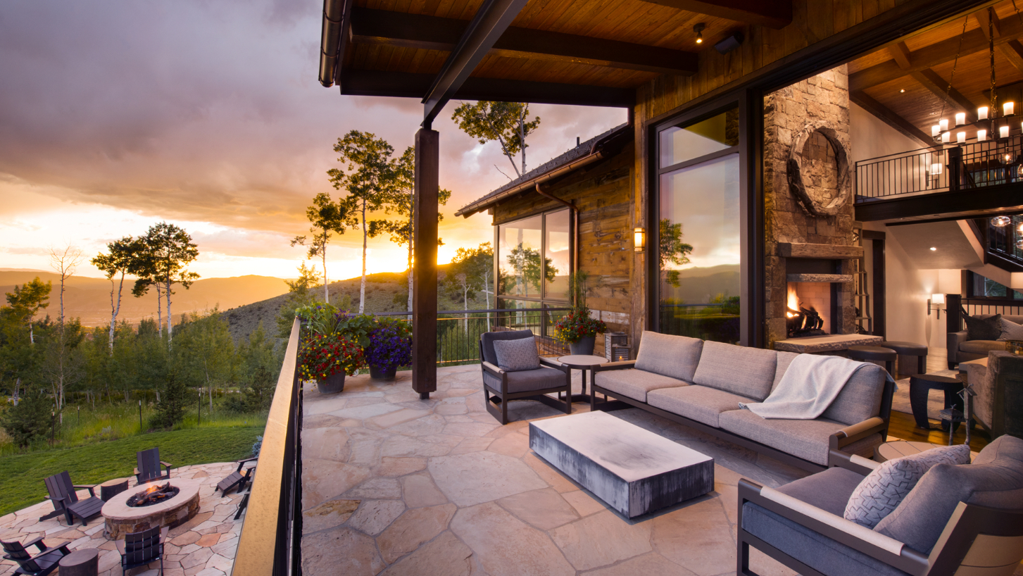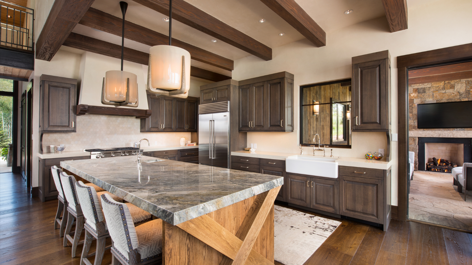 The architecture of this home consists of traditional vernacular gabled roof forms with cleanly detailed heavy timber roof rafters and shed roof elements supported by steel beams and wood struts, that, along with the steel railings and large windows, have a contemporary expression. The handsome exterior palette of natural materials include a warm toned dry-stack stone veneer base, Colorado Buff flagstone patios and walkways around the house, a combination of rich weathered brown toned reclaimed siding and a copper roof, gutters and downspouts.