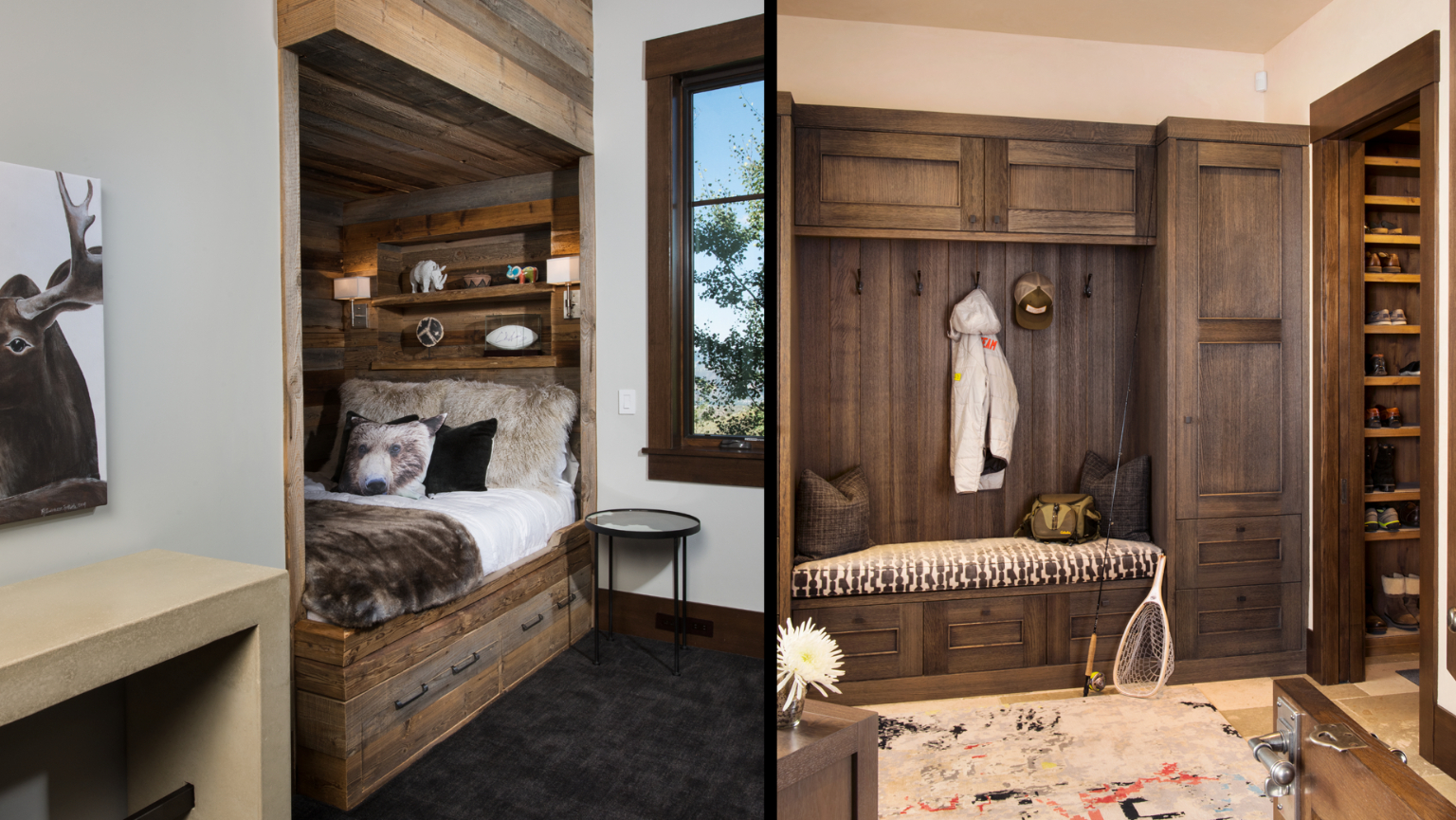 The home’s upper level, accessed via a dramatic open stair and steel bridge above the main entry and living areas, has a small sitting area and two generous guest rooms with private baths and beautiful views. The lower level includes a bunk room with three bunk beds and bathroom, a gracious guest room with bath, mechanical, storage and a spa bathroom/changing area just inside from the exterior Jacuzzi. This level also features a large family rec room with a bar, pool table, card game table, and sitting area with fireplace and TV and a reclaimed wood accent wall. The family room has access to a large flagstone patio with fire pit nestled into the landscape and partially covered by the main level deck above also oriented towards the site’s dramatic views.