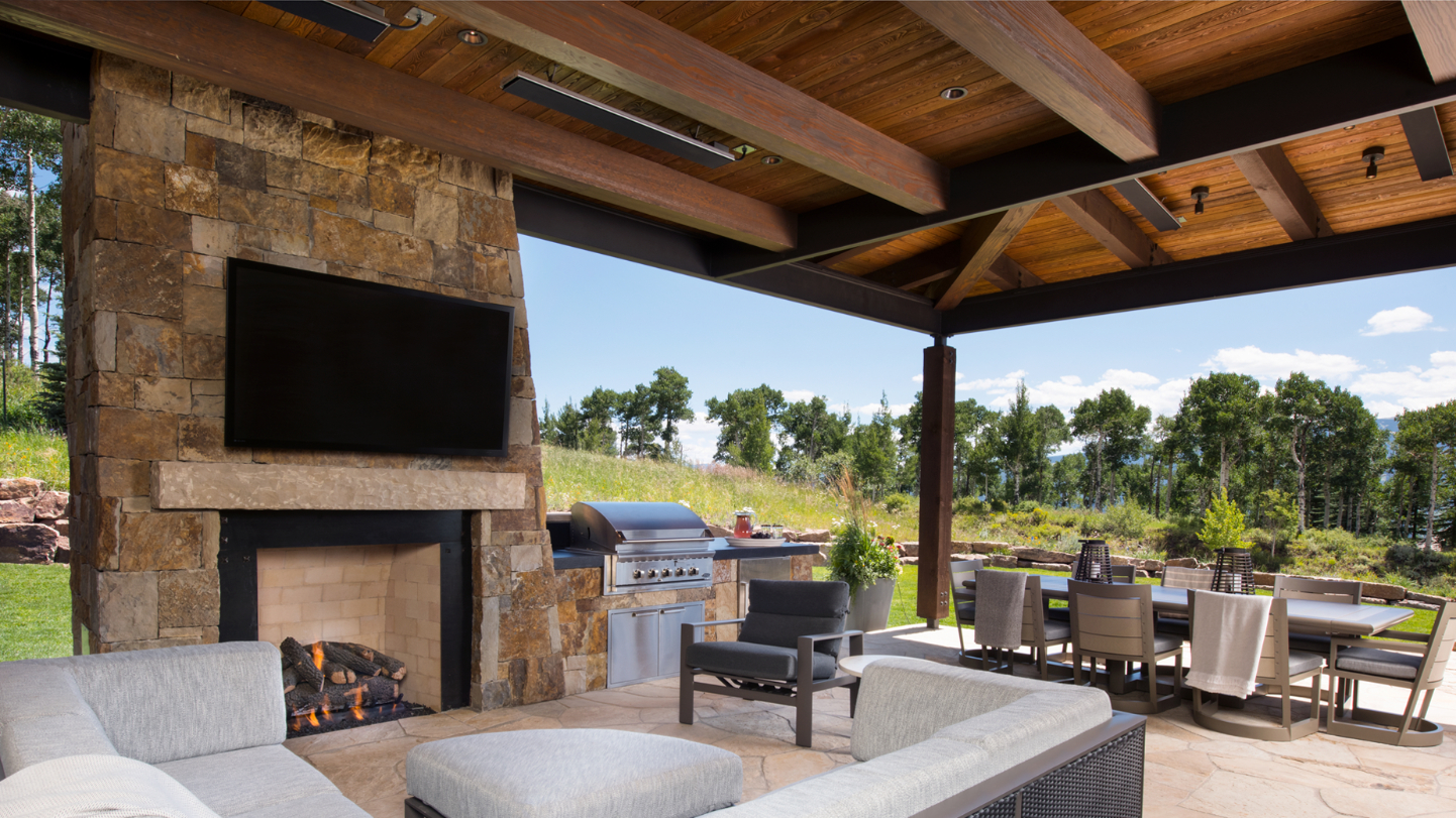 The completed home also achieved the clients’ goal of having a three car garage, a formal dining room, an open plan great room living/kitchen area with built-in breakfast nook and a small sitting area just off the kitchen, a mud room, a laundry room, an office and a master suite all on the same level with all primary spaces oriented to the fantastic views to the south and west and to have ample opportunity for indoor/outdoor living. The vaulted wood ceiling living room space with 14’ wide by 12’ tall lift and slide doors, high windows, elegant wood beams, and a generous seating area focused on a large fireplace and the incredible views to the south provide a dramatic space well suited for entertaining. The kitchen has a large island perfect for family gatherings and entertaining, while the sitting area off the kitchen with its fireplace, TV and breakfast area provide a cozy living area within an expansive house when only the husband and wife are at home. The large lift and slide doors open the kitchen sitting area and living room up to a large, partially covered deck off the south side of the house which connects to a covered outdoor living room on the southeast side of the home. The outdoor room features a sitting area focused around an outdoor fireplace and TV, a built-in BBQ and covered outdoor dining area with incredible views to the south- all tempered from cool nights by recessed infrared heaters in ceiling.