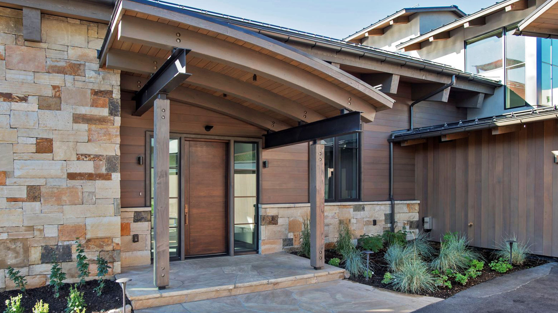 Exterior materials were carefully selected to balance cost-effectiveness with durability and sustainability. Stone, stucco, and limited wood siding combine to create a low maintenance yet visually striking façade, complemented by exposed wood and steel beams that showcase modern detailing.