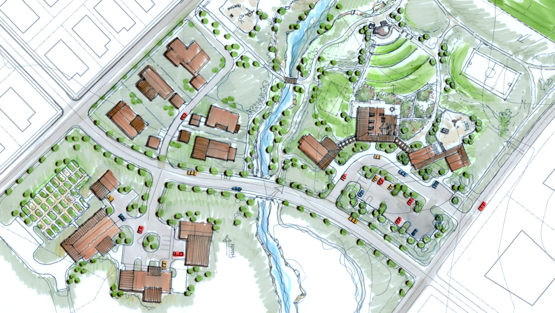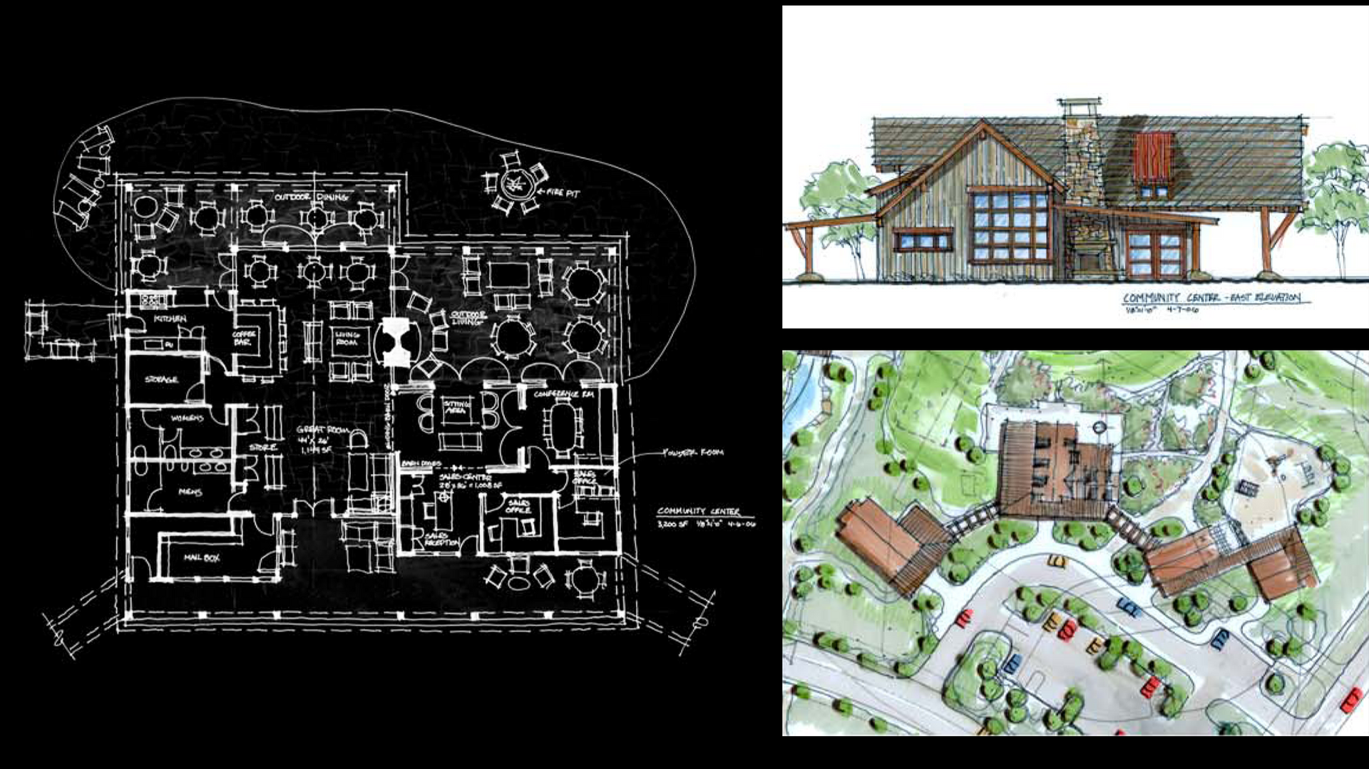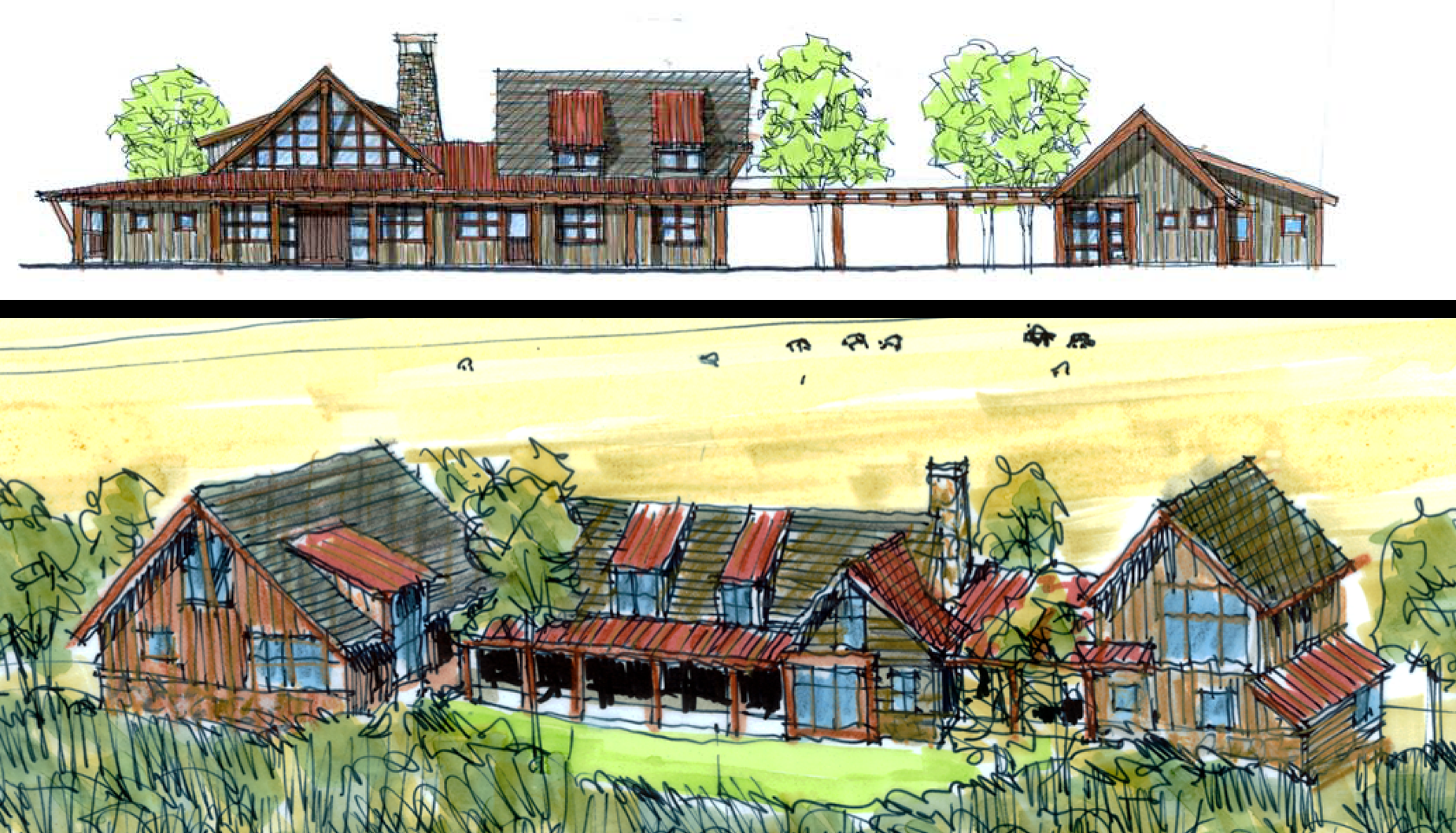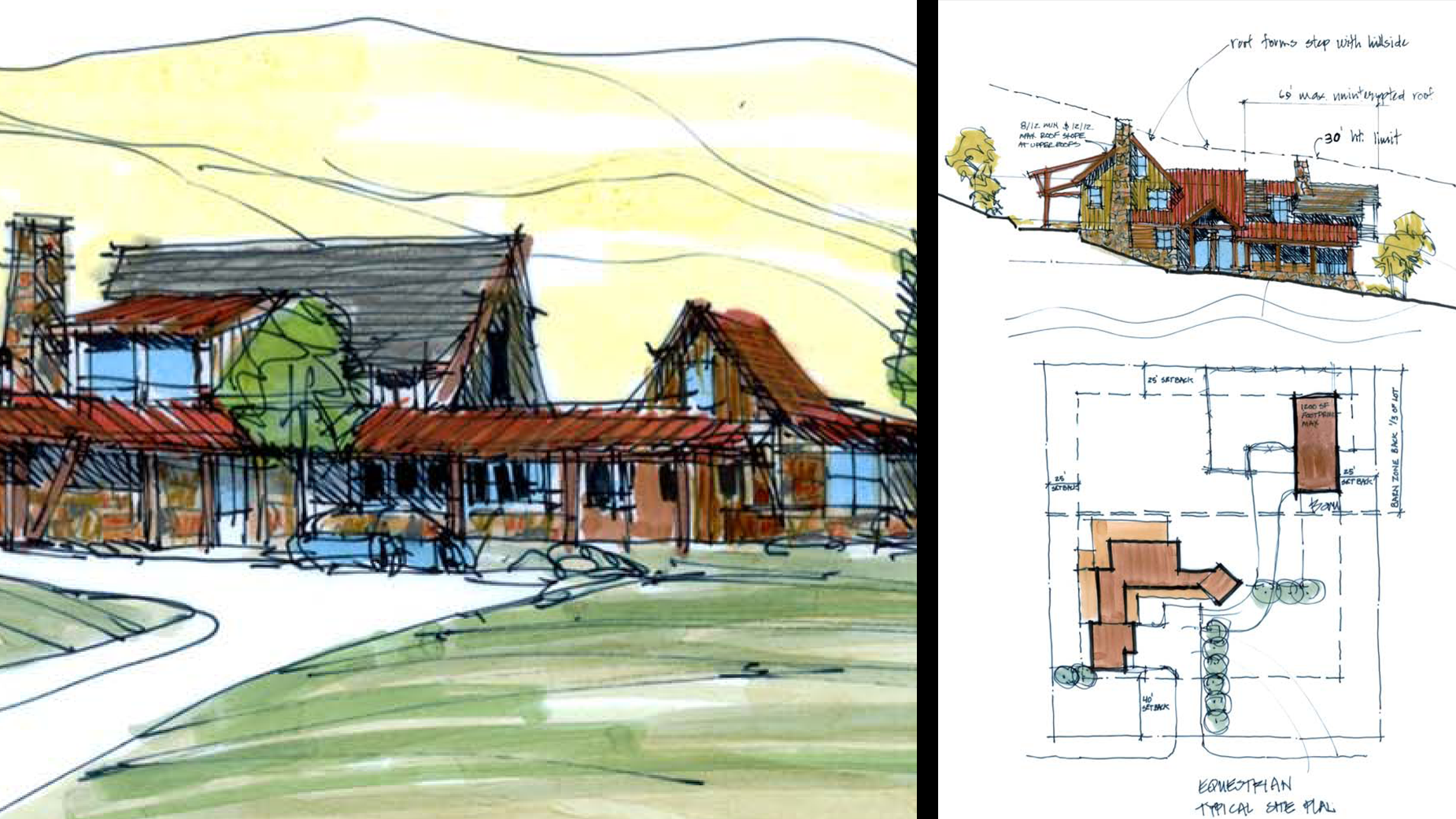 Berglund Architects worked with the projects' developers as well as the land planning firm Design Workshop to envision the architectural community character and developed concept architectural design guidelines for this rural equestrian based development. Berglund Architects created a wide range of site plan diagrams, elevation sketches, perspective drawings of potential houses and community/streetscape character sketches to illustrate the architectural design principles it developed for the different neighborhoods. These studies became the basis of the lot sizing, building setbacks and neighborhood layouts. Berglund Architects also site-planned and developed conceptual architectural design for the community center and equestrian facilities. All of these sketches were created during a collaborative three day on site work session with the developers and Design Workshop.