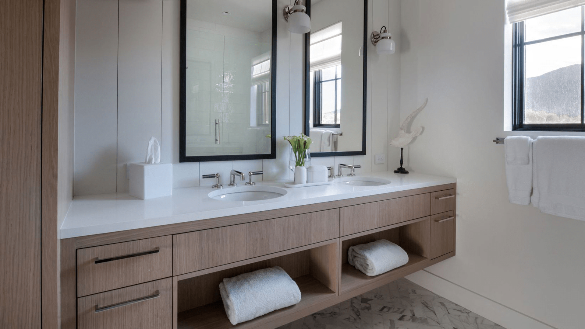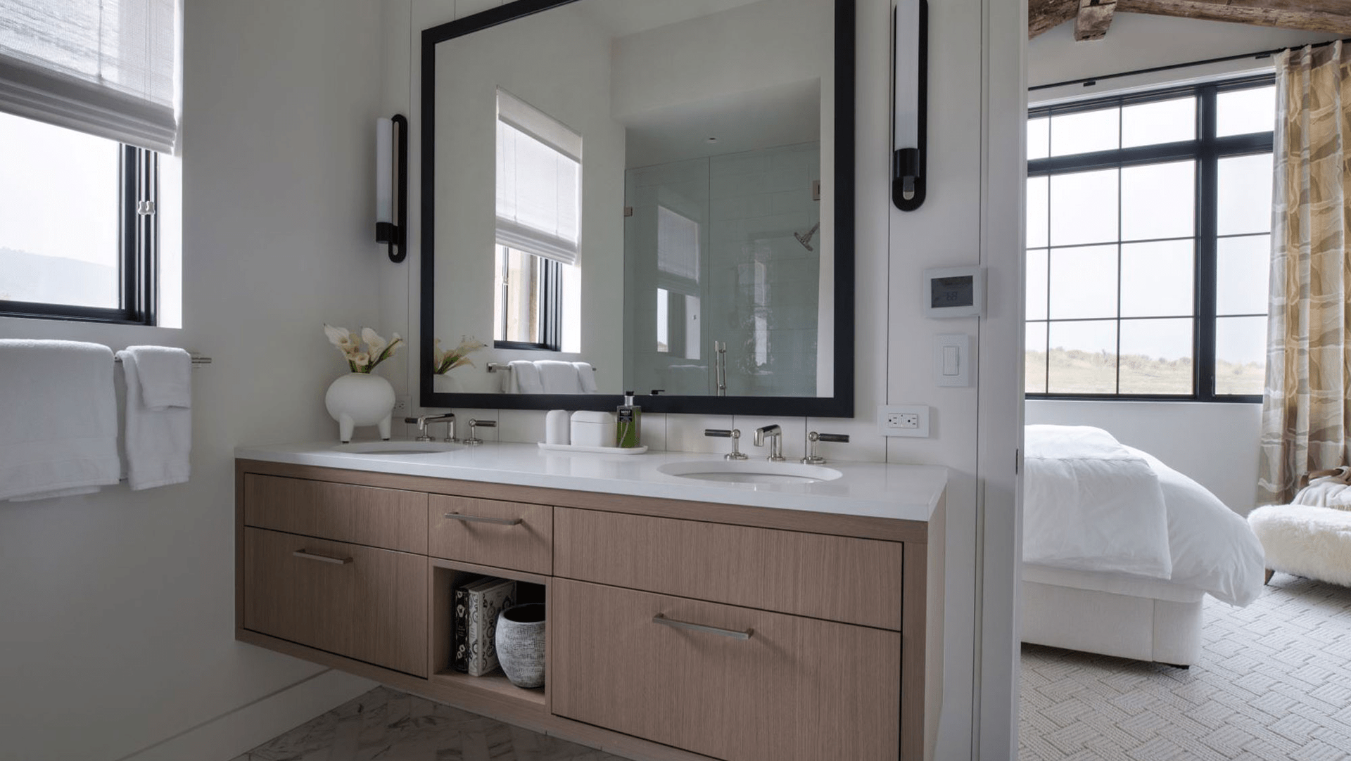 The aesthetic carries through to the bedrooms and bathrooms, combining a clean white palette and warm wood cabinetry with touches of industrial steel on the windows, light sconces and framed mirrors. The flooring transitions into the private space with soft wool carpet and modern grey marble tile underfoot.