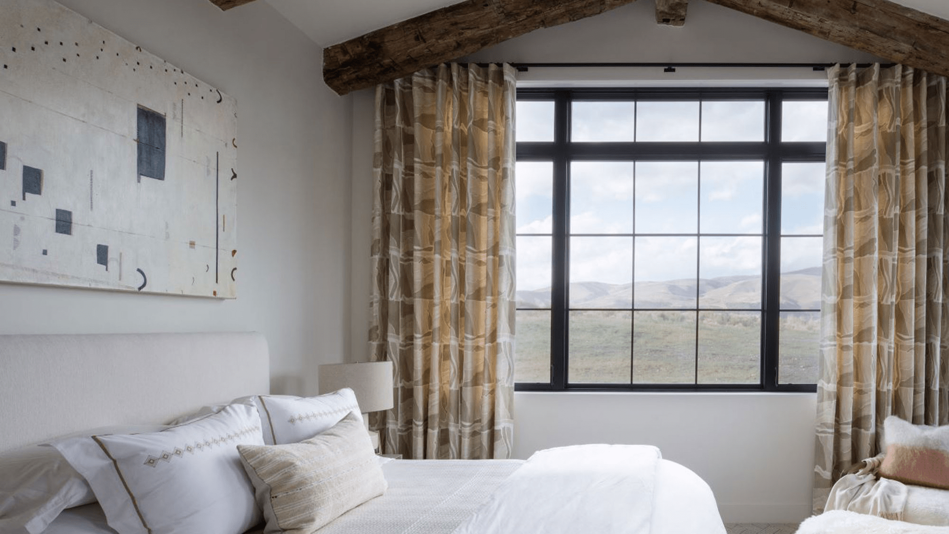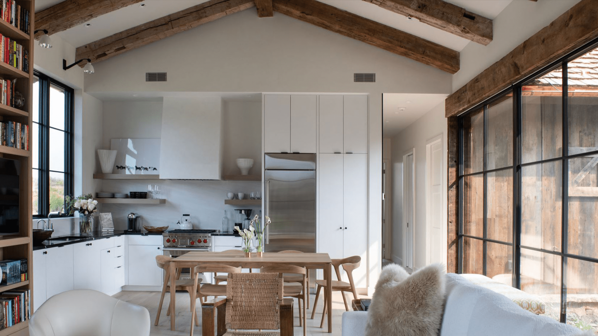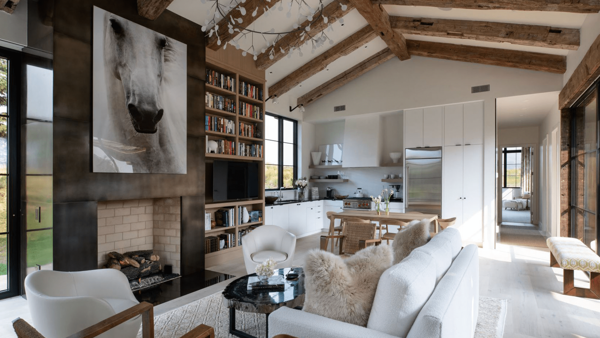 The theme of meshing modern and traditional elements continues with the cleanly detailed steel paneling at the fireplace juxtaposed to the rustic reclaimed wood beams on the ceiling. Drywall trimmed windows and white doors and walls throughout evoke a bright, modern feel which is complimented by the light wide-plank oak floors.