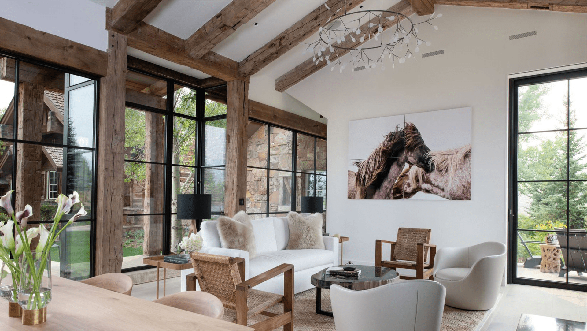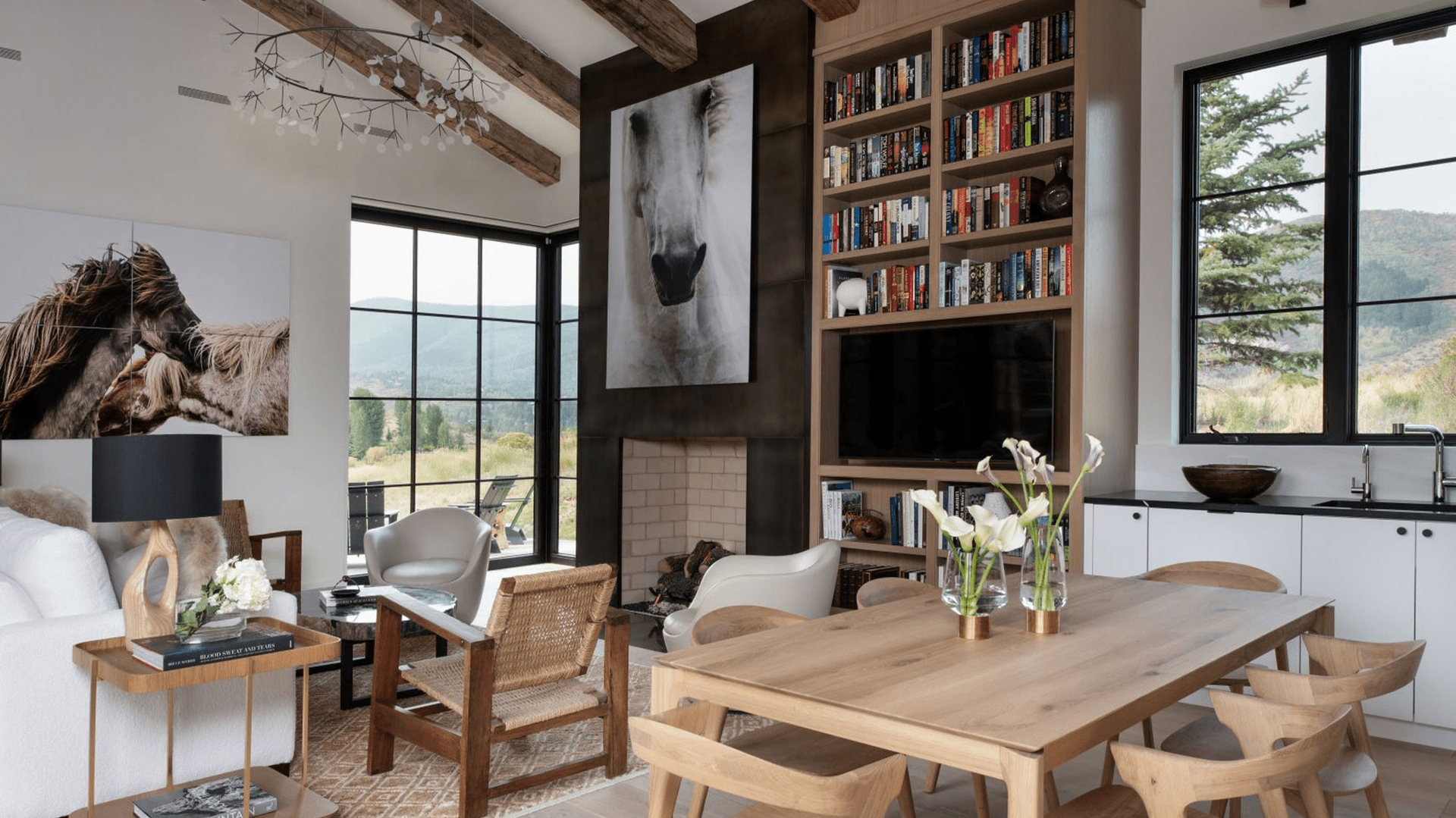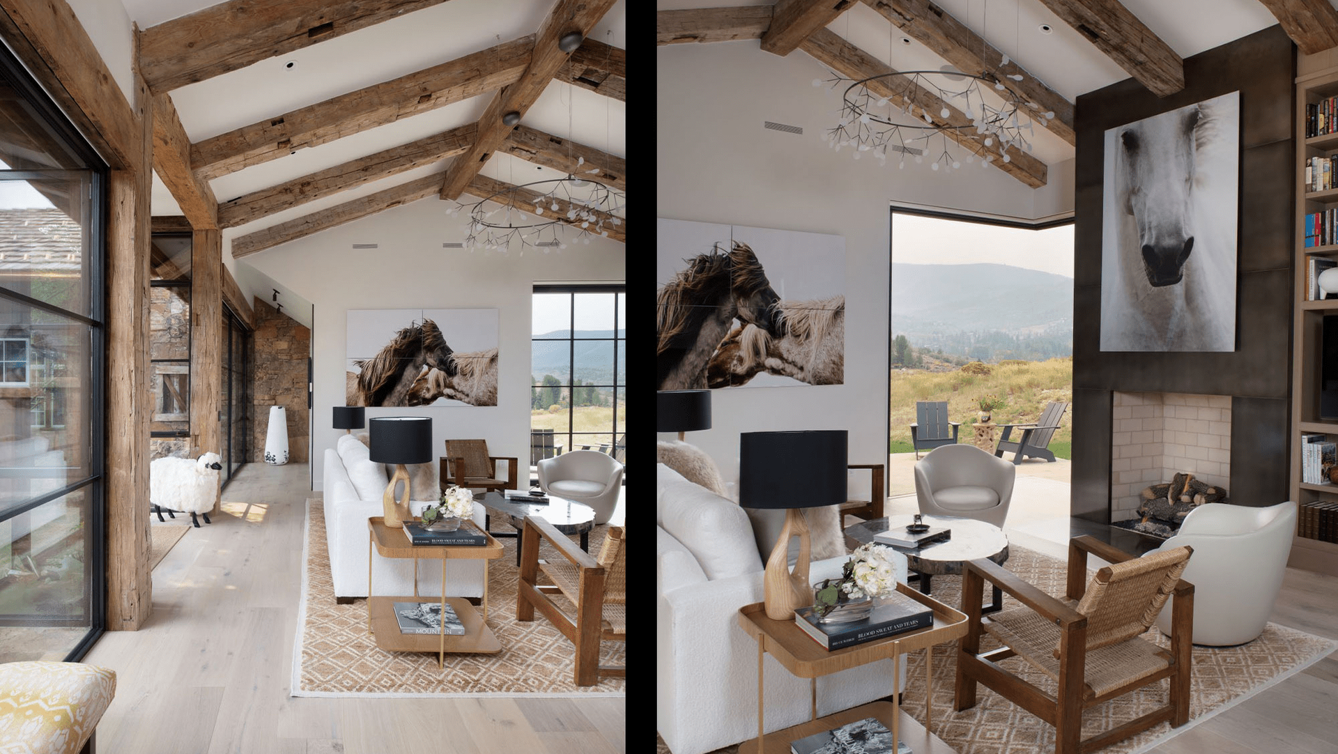 The traditional ranch style home, tucked into a hillside with spectacular 360-degree mountain views, features a material palette of reclaimed wood, stone, glass and wood shake roof which blend in with the natural surroundings.