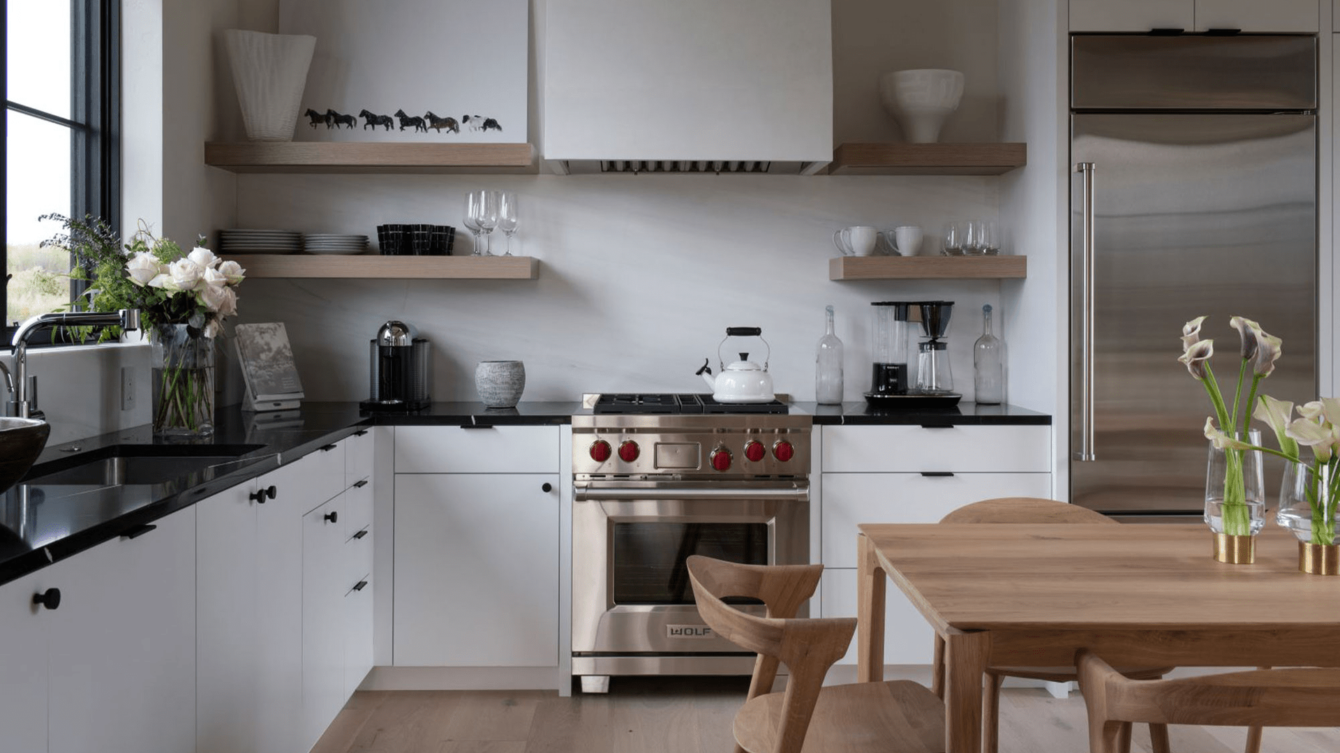 The simple black and white kitchen area, softened with wood elements and decorative knobs and pulls, straddles this modern vs. traditional aesthetic.