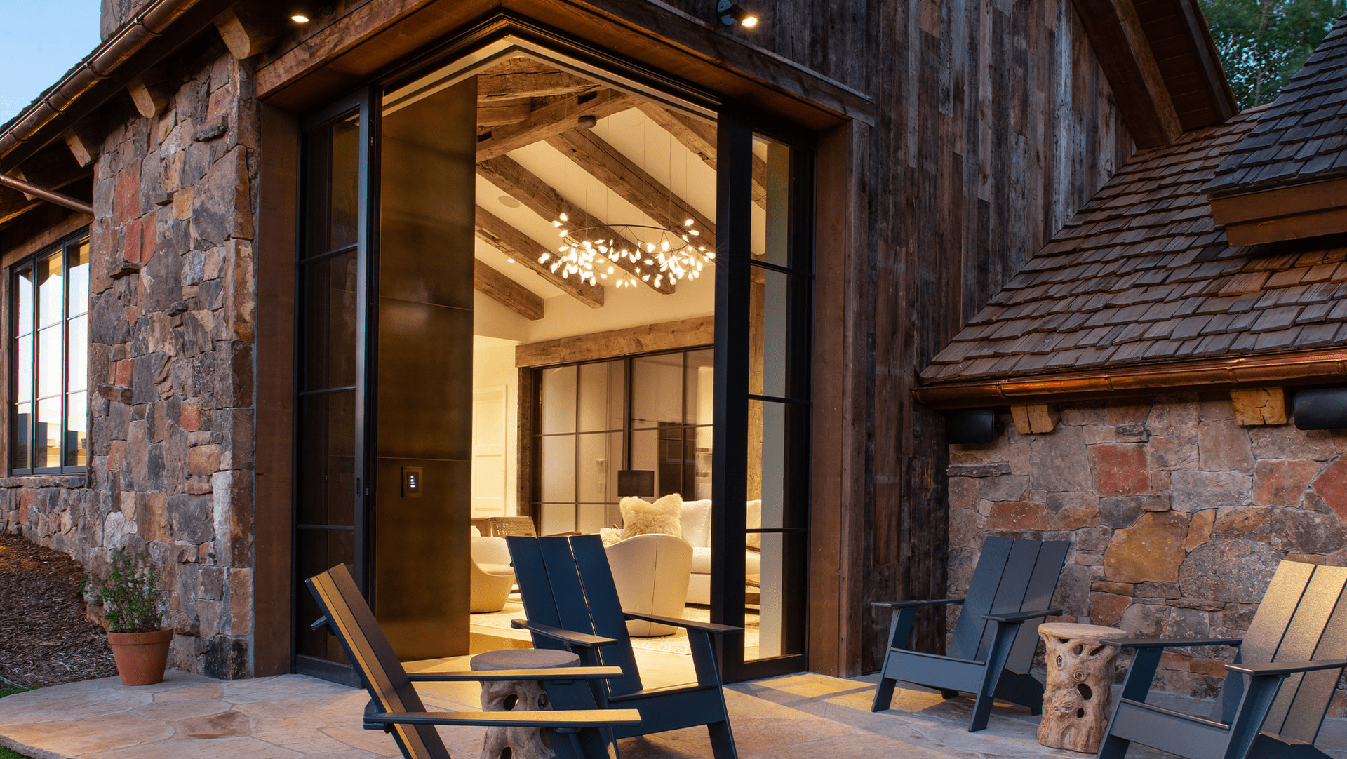 The transparency of the sleek steel windows and clean edged details in the open living room contrast to the rustic stone and wood-clad gabled elements, creating a simple but powerful aesthetic mixing modern and traditional architecture.