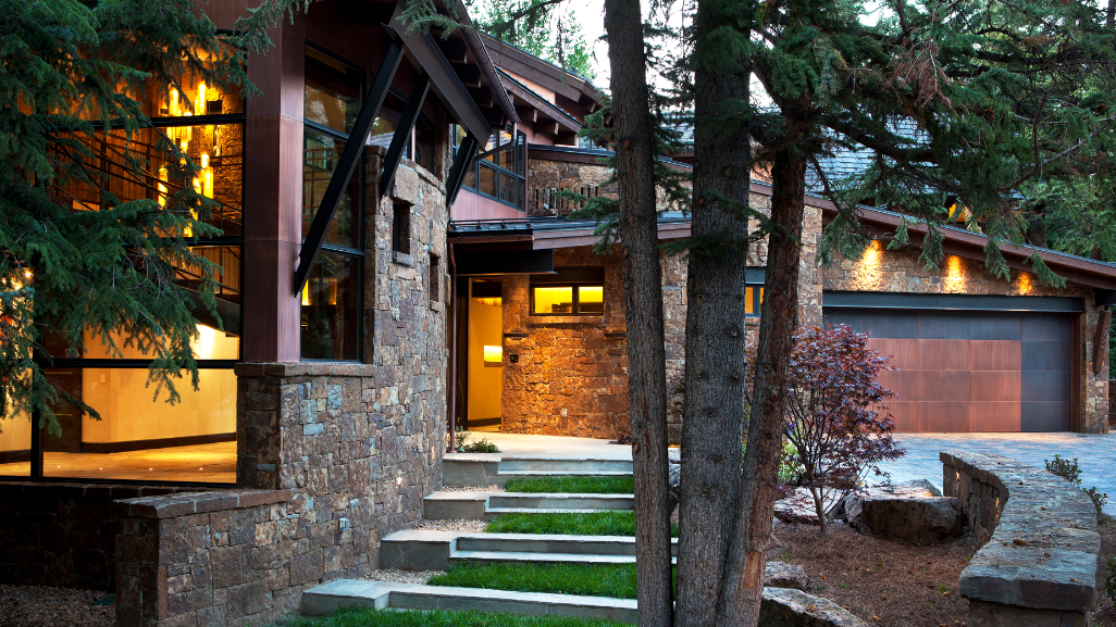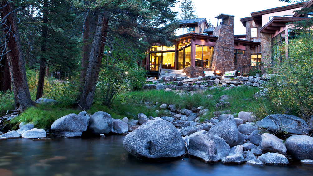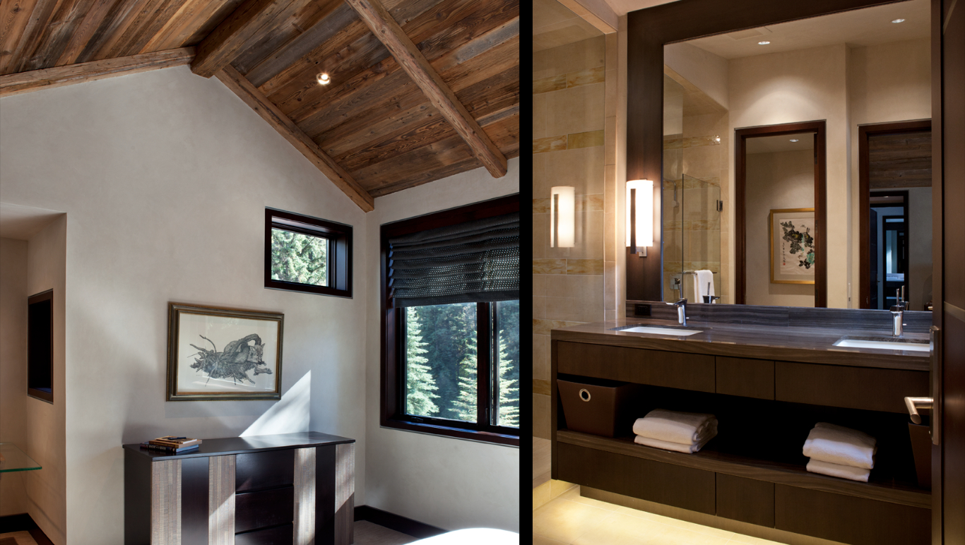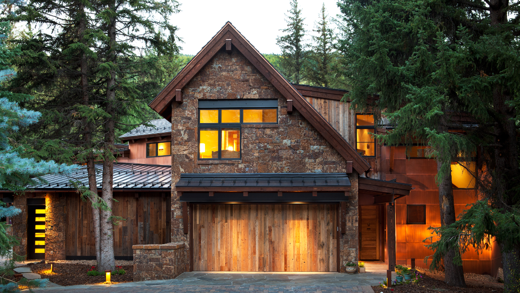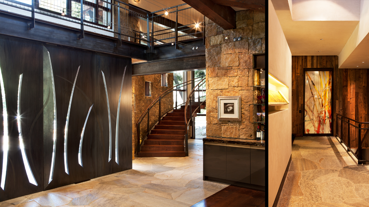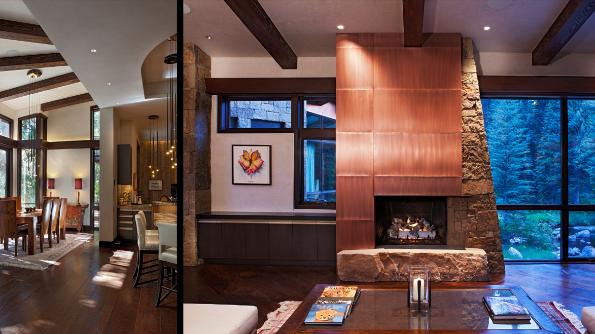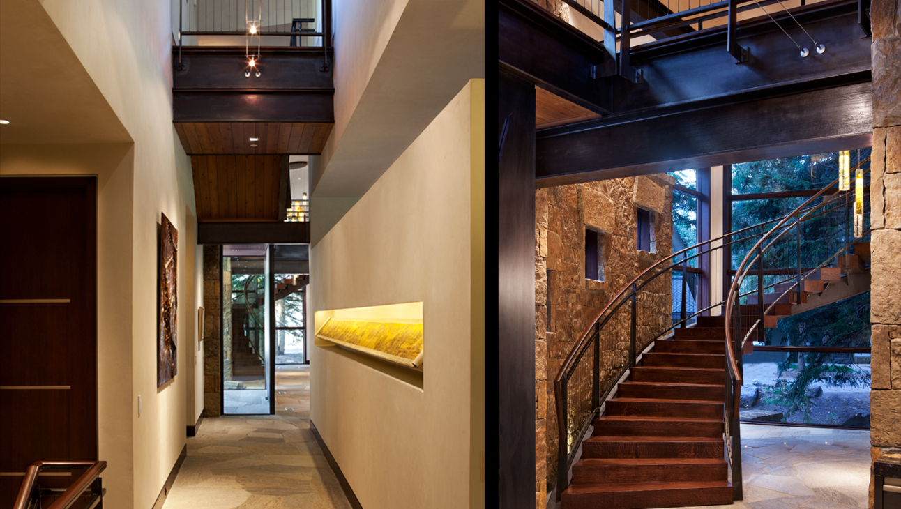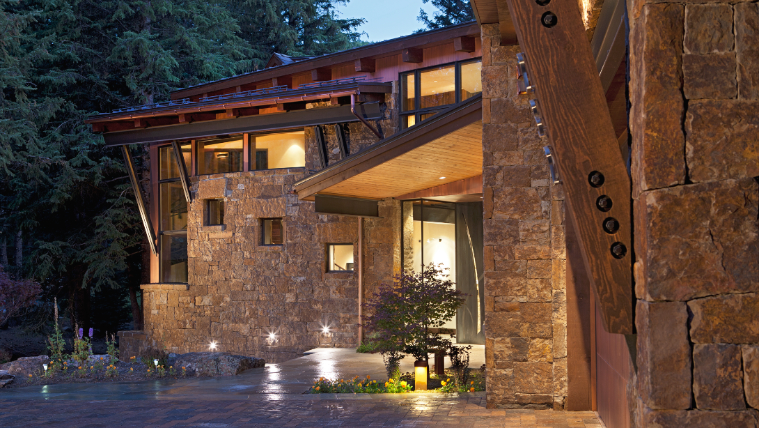 This 10,000 SF Residence has a 7700 SF primary living unit with four bedrooms and 800 SF home office suite. There is a Secondary living unit that is a 1500 SF 2 bedroom suite over the primary home office. The open floorplan and large sliding doors open to outdoor spaces that step down to the creek. The house was designed to integrate itself into the landscape and the design team worked with arborist to ensure all existing spruce trees on the site would be protected during construction and the life of the home. Berglund Architects utilized extensive 3D renderings, as part of its architectural and interior design services. The palette of the exterior materials blends into the surrounding landscape and includes a local stone veneer, reclaimed weathered wood siding, large heavy timber supported roof overhangs for protection from the elements and sun, dark patinaed exposed steel structural elements and steel railings throughout. The home was completed in late 2013.