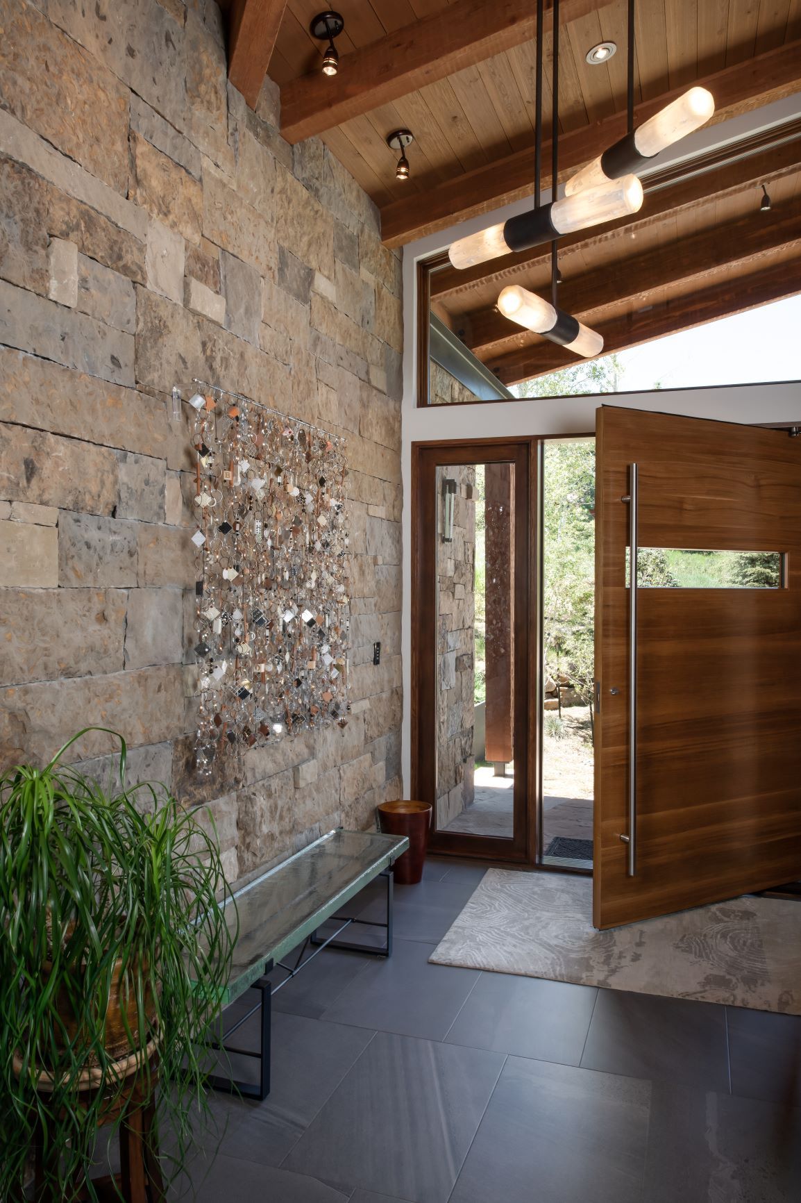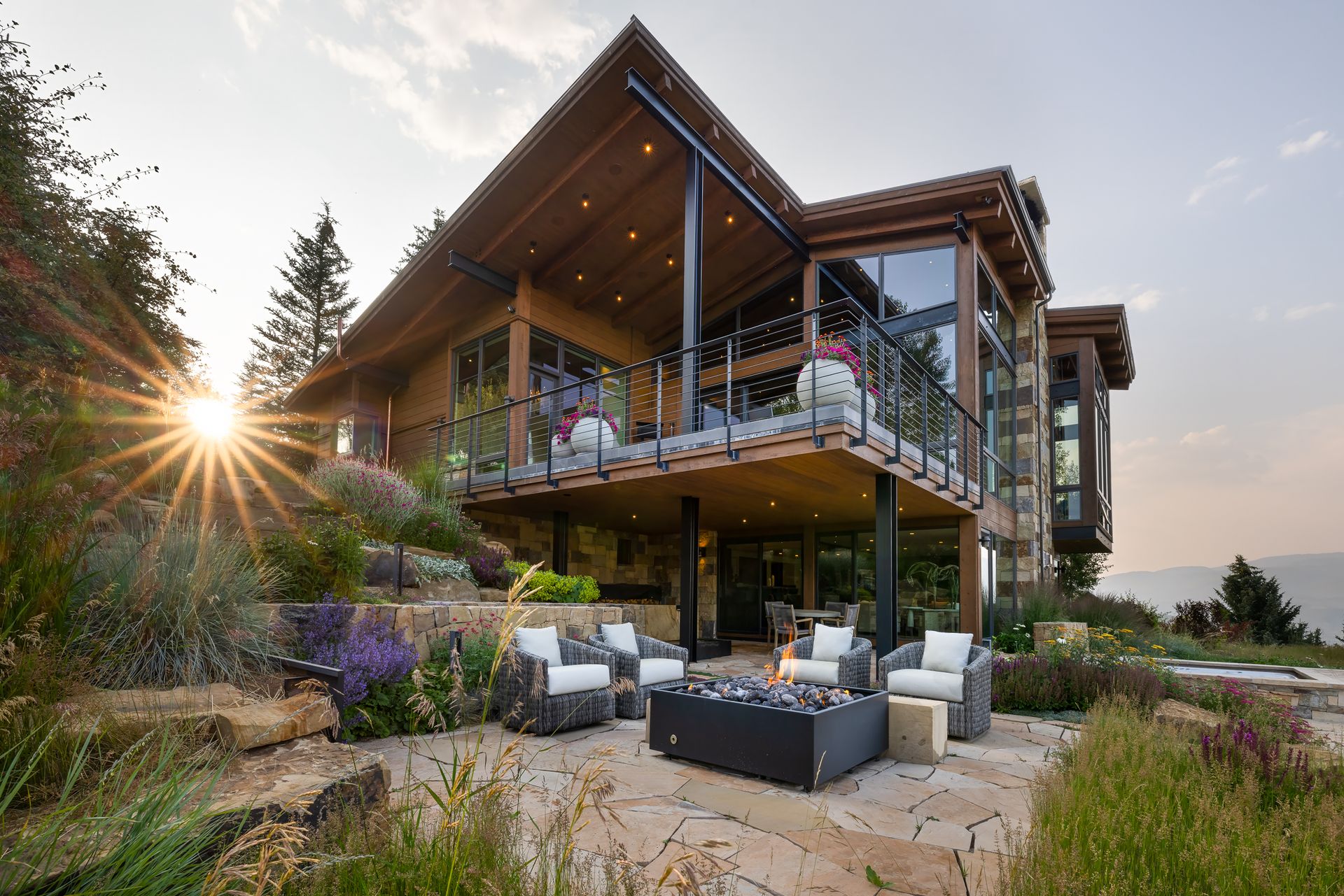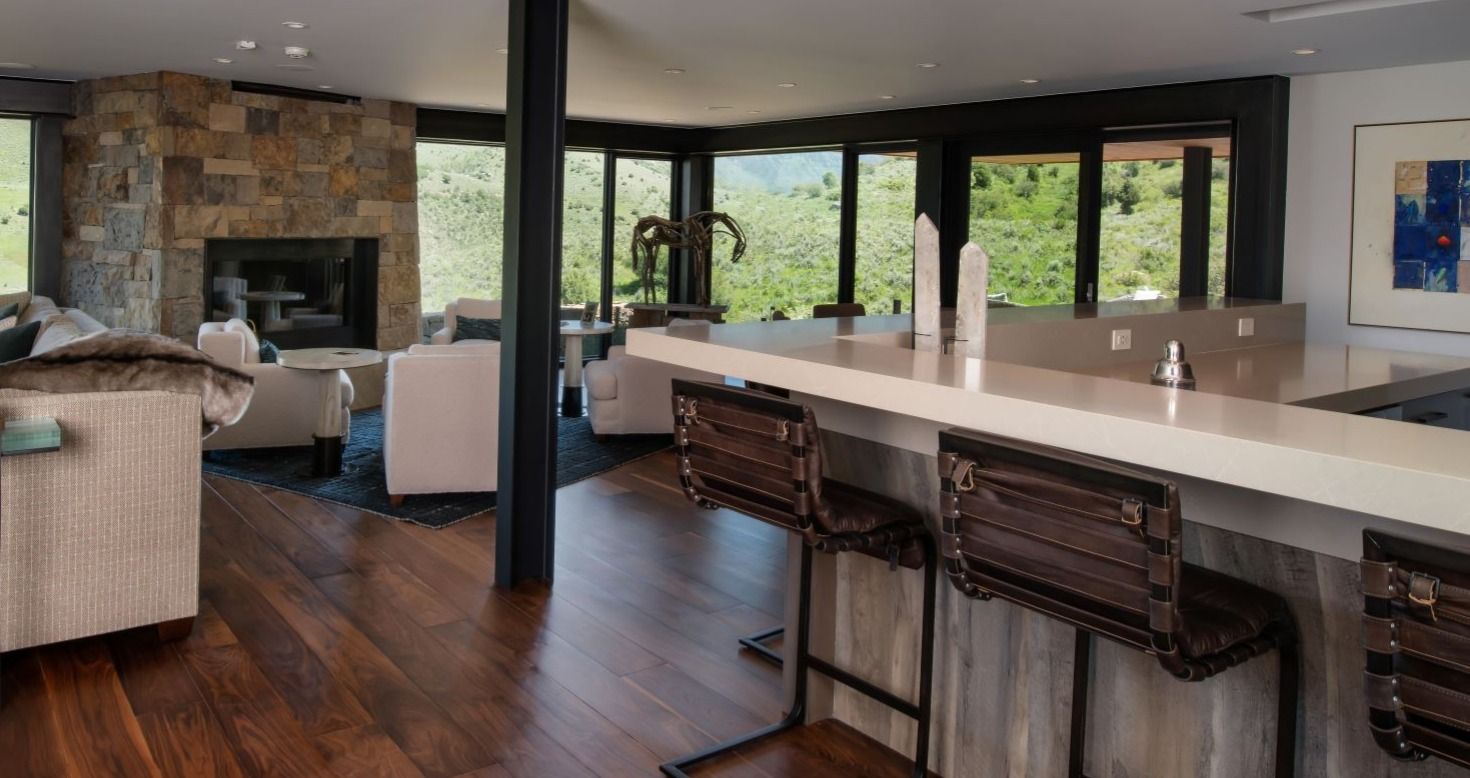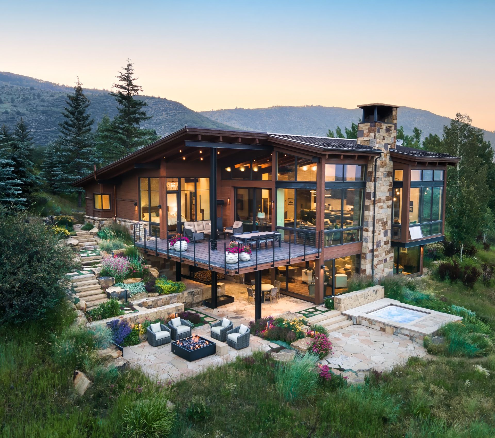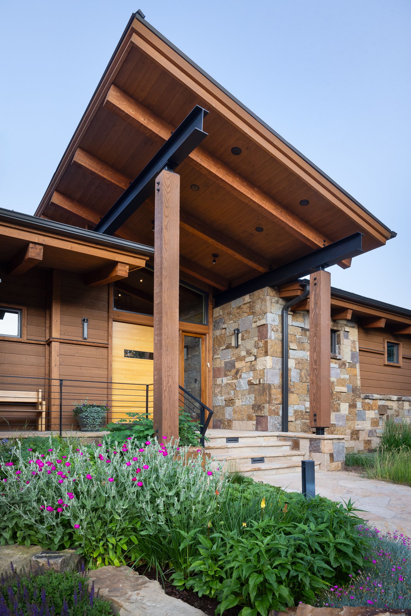 All of the exterior materials and windows were replaced, transforming the non-descript existing house into an elegant mountain contemporary design with a rich exterior palette of warm natural materials including dry stack stone, warn brown toned horizontal siding, refined steel railings and cleanly detailed exposed steel beams supporting heavy timber beams and roof rafters.