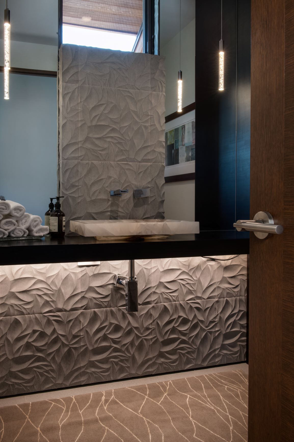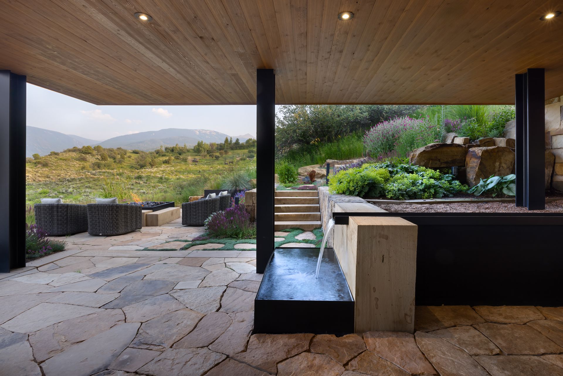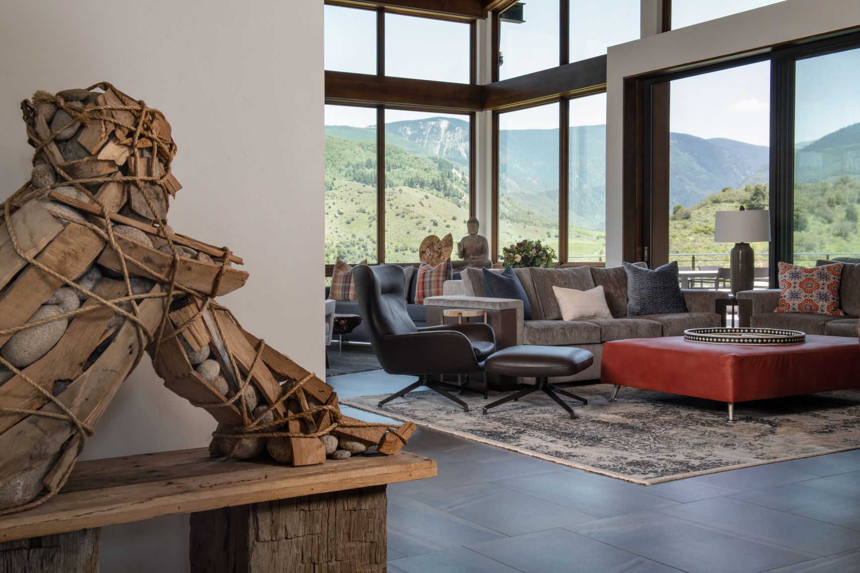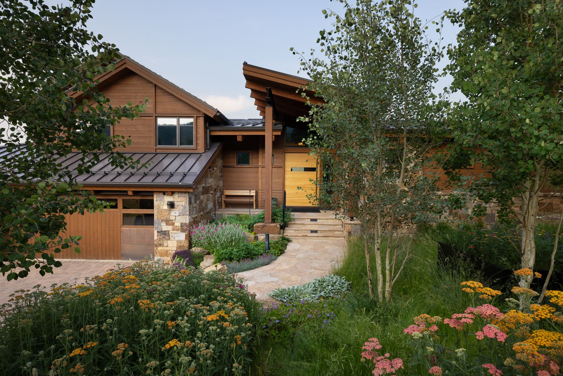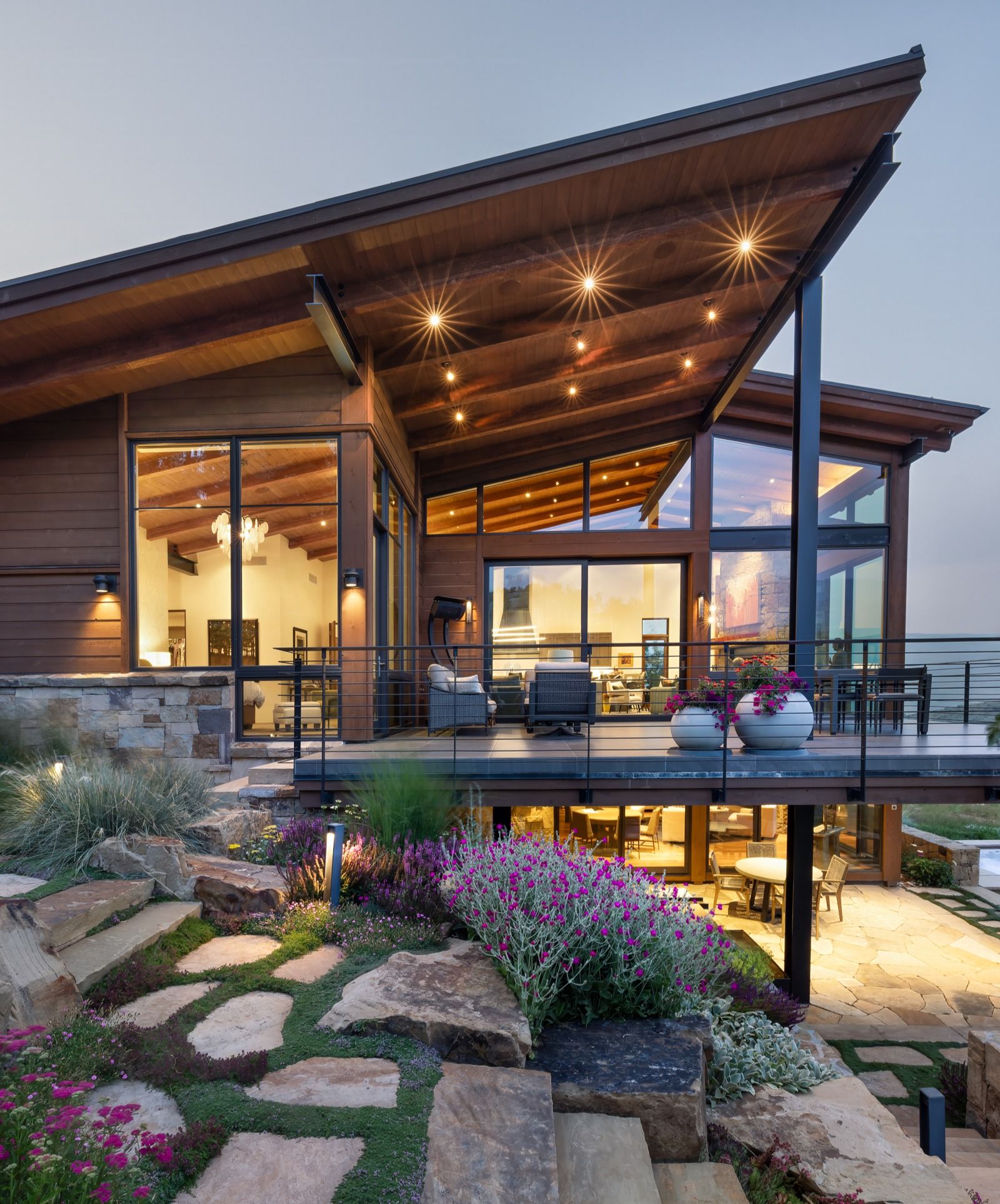 All of the exterior materials and windows were replaced, transforming the non-descript existing house into an elegant mountain contemporary design with a rich exterior palette of warm natural materials including dry stack stone, warn brown toned horizontal siding, refined steel railings and cleanly detailed exposed steel beams supporting heavy timber beams and roof rafters.