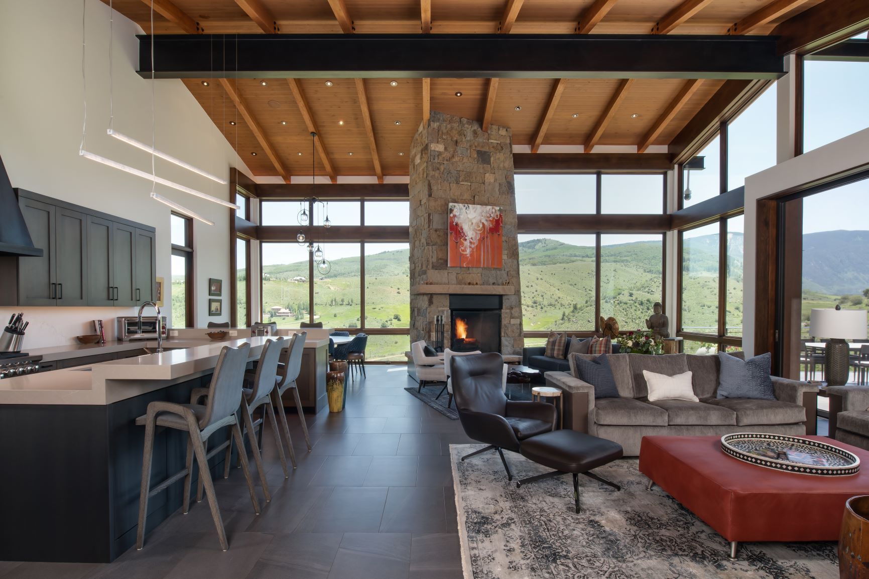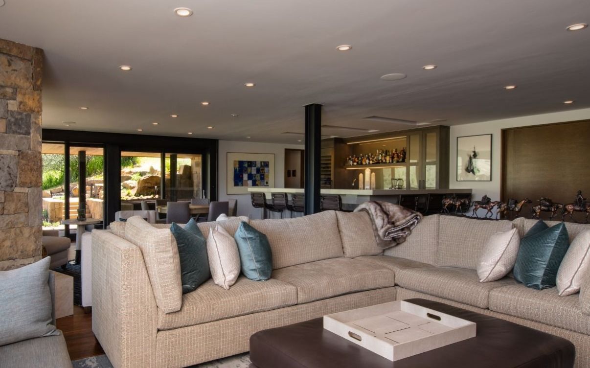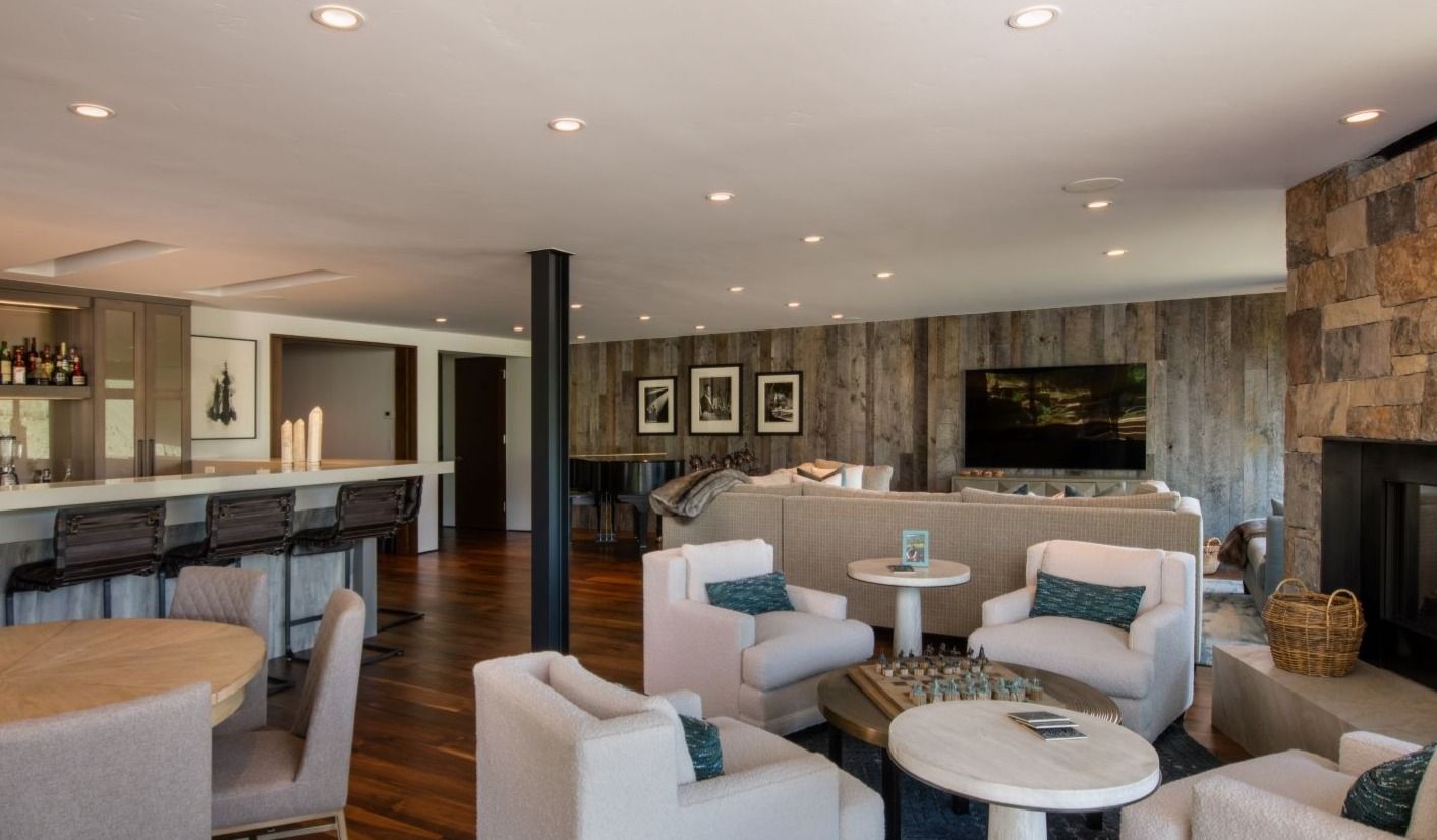 The approximately 3,000 SF addition includes a vaulted great room, kitchen/dining/living area with a baby grand piano, entry, powder room, small TV/sitting area and a generous master suite. The great room has a cleanly detailed wood ceiling and wood beams supported by an exposed steel ridge beam. Together with this, floor to ceiling windows on the east wall and large lift and slide doors which pocket into the wall provide for indoor/outdoor living, with nearly the entire south wall opening up to a large, covered outdoor sitting and dining area. The near transparency of the room’s window walls are grounded by the large floor to ceiling stone fireplace. Two walls of the master bedroom are also composed of floor to ceiling windows and a window which wraps the corner of the shower capture the site’s fantastic views. A large TV room with pool table area and an office niche is below the great room with a walkout to a lower level patio with hot tub and fire pit, and a basement below the master suite creates ample storage space.