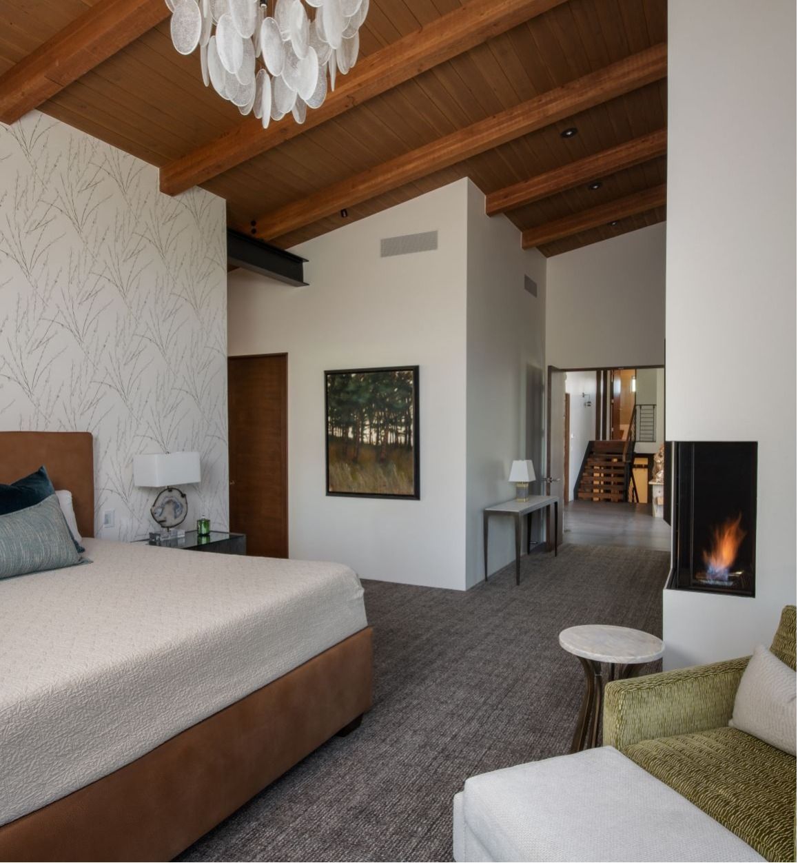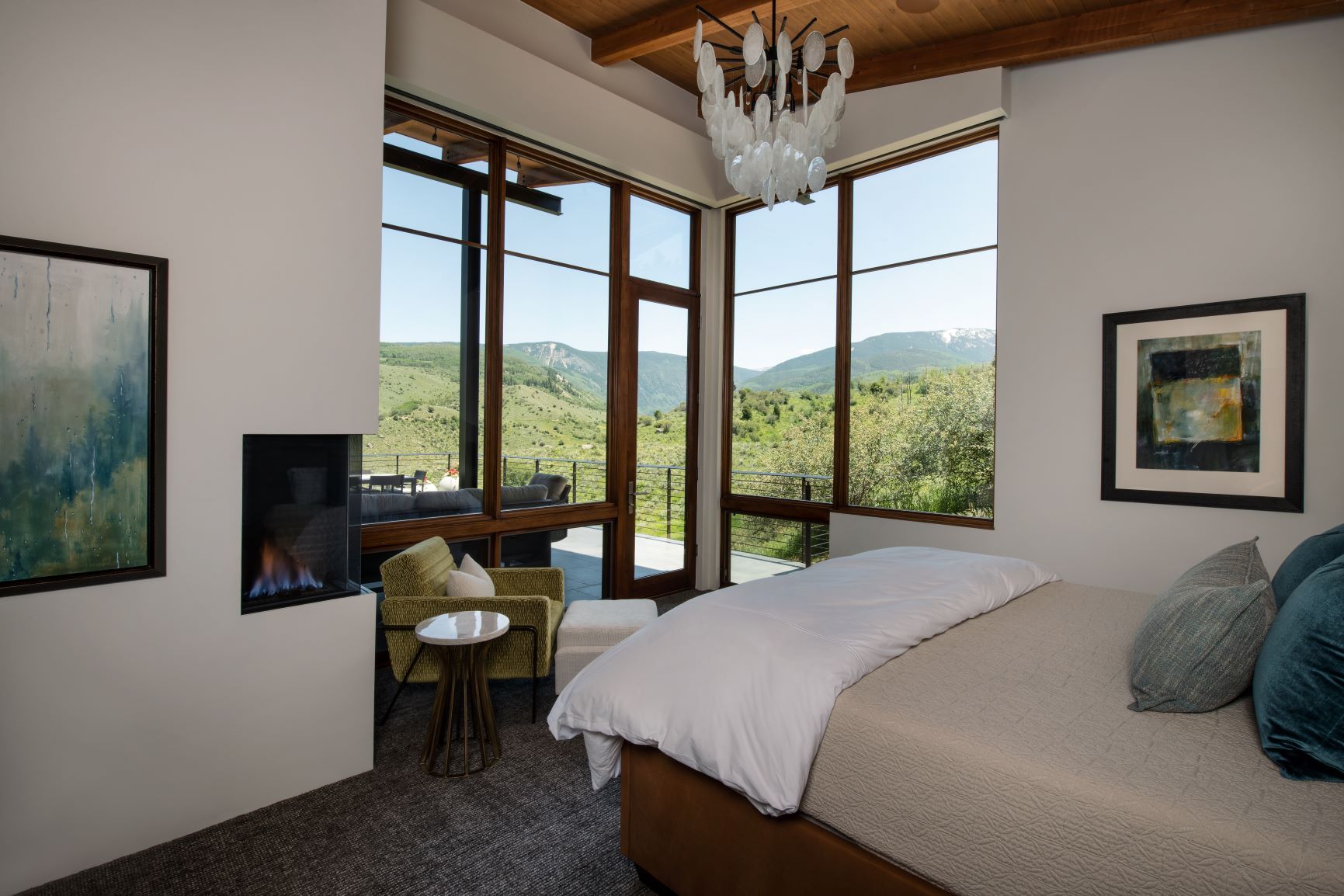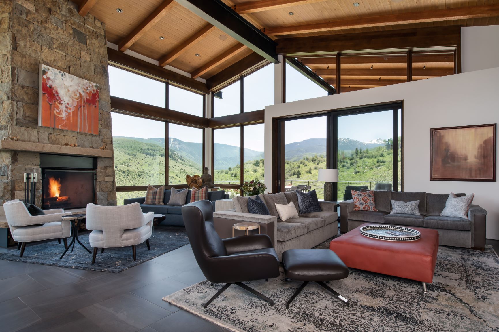 The approximately 3,000 SF addition includes a vaulted great room, kitchen/dining/living area with a baby grand piano, entry, powder room, small TV/sitting area and a generous master suite. The great room has a cleanly detailed wood ceiling and wood beams supported by an exposed steel ridge beam. Together with this, floor to ceiling windows on the east wall and large lift and slide doors which pocket into the wall provide for indoor/outdoor living, with nearly the entire south wall opening up to a large, covered outdoor sitting and dining area. The near transparency of the room’s window walls are grounded by the large floor to ceiling stone fireplace. Two walls of the master bedroom are also composed of floor to ceiling windows and a window which wraps the corner of the shower capture the site’s fantastic views. A large TV room with pool table area and an office niche is below the great room with a walkout to a lower level patio with hot tub and fire pit, and a basement below the master suite creates ample storage space.