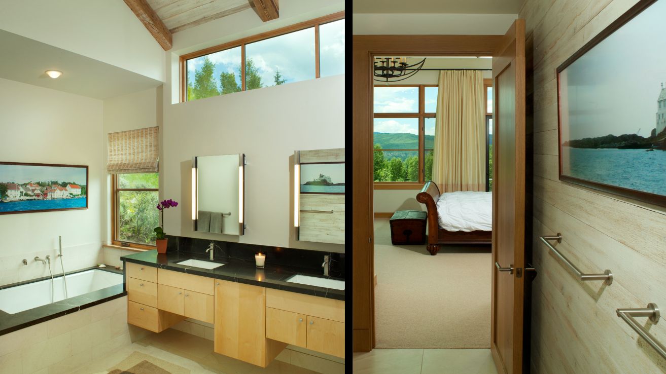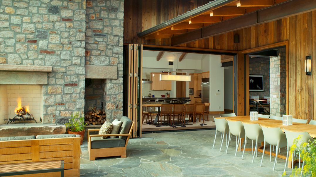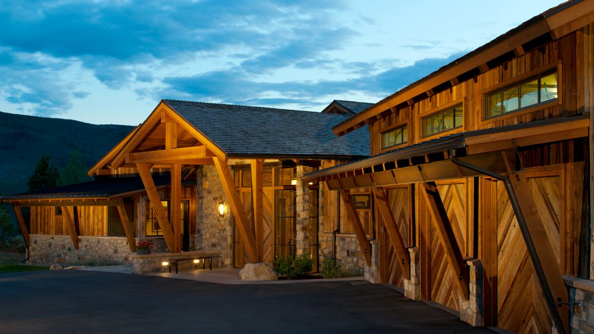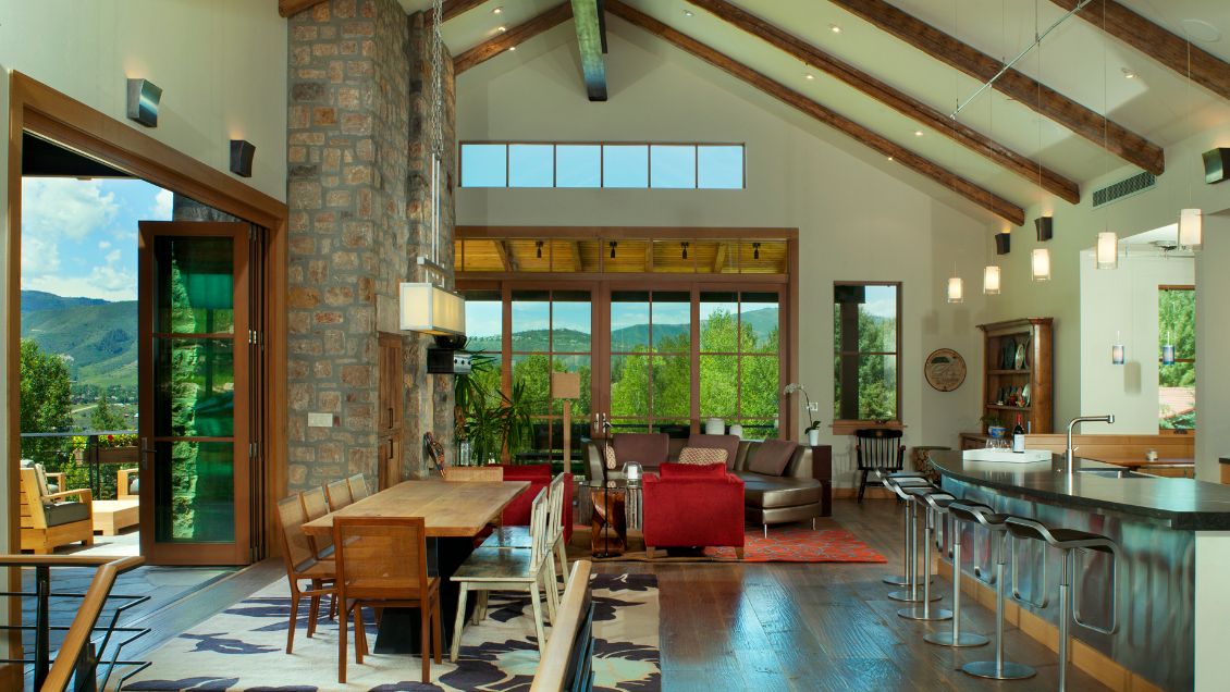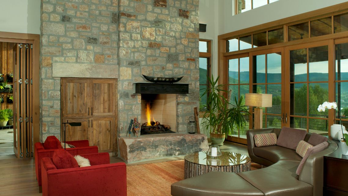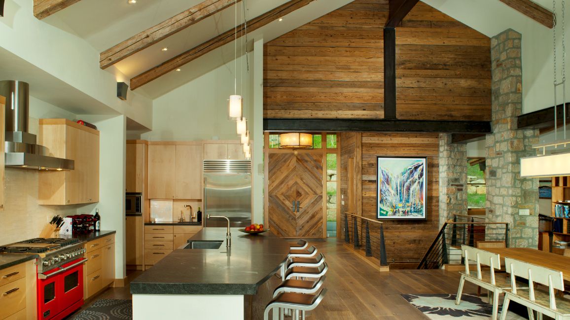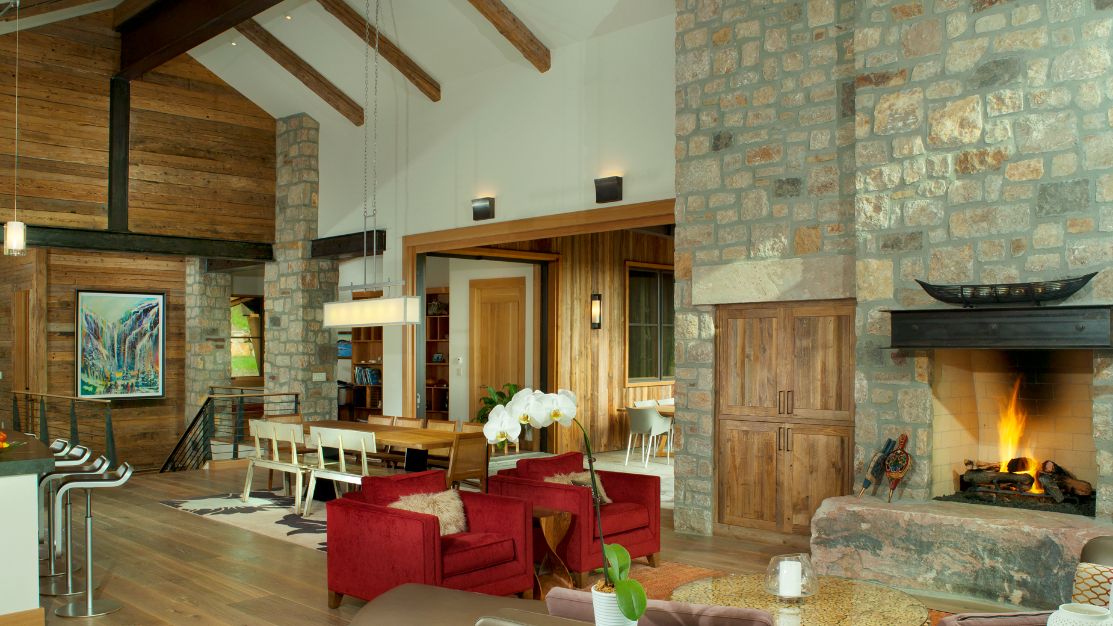 This 7,500 SF 6 bedroom LEED designed home is focused around a central stone covered courtyard with large sliding and accordion door systems which allow the interior rooms to flow out to the covered outdoor dining and seating areas as well as an outdoor fireplace. The home is configured of three wings with fire treated wood shingle roofs connected by low slope metal roofs which are rotated relative to each other better integrate the house into the site, reduce its mass, take best advantage of the views, maximize solar exposure for the PV and hot water solar panels on the master wing roof, and to create a more dynamic design. The palette of the exterior materials blends into the surrounding landscape and includes a local stone veneer, reclaimed weathered wood siding, large heavy timber supported roof overhangs for protection from the elements and sun, dark patinated exposed steel structural elements and steel railings throughout.