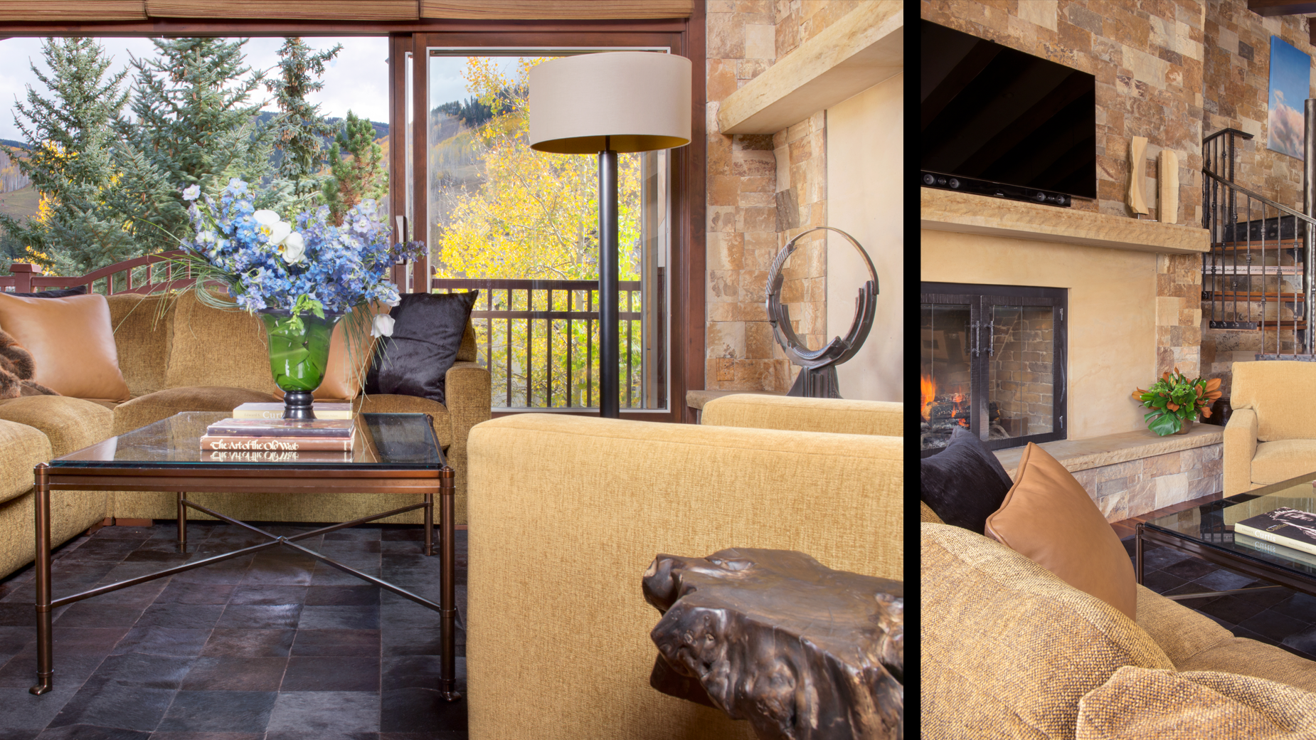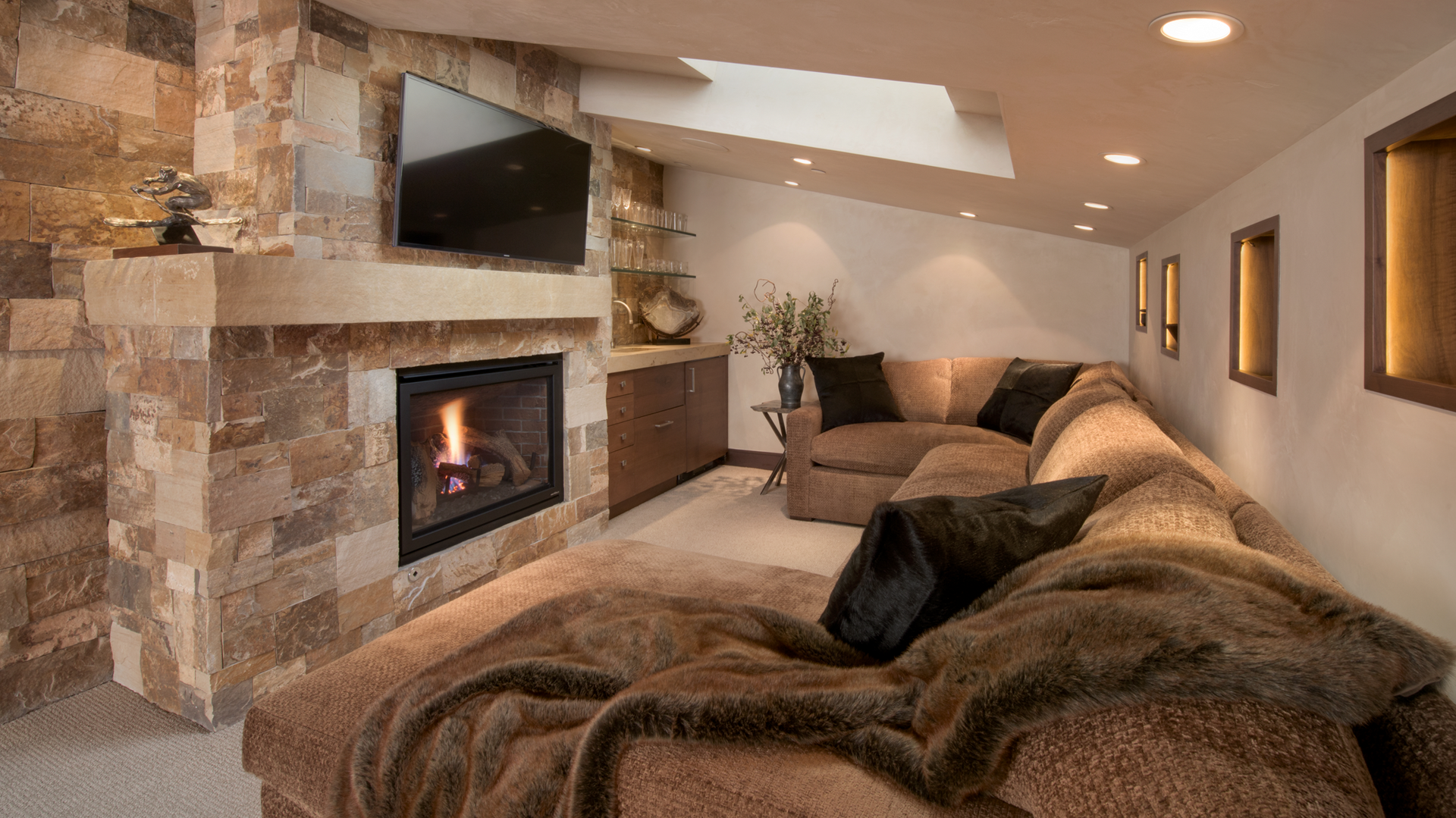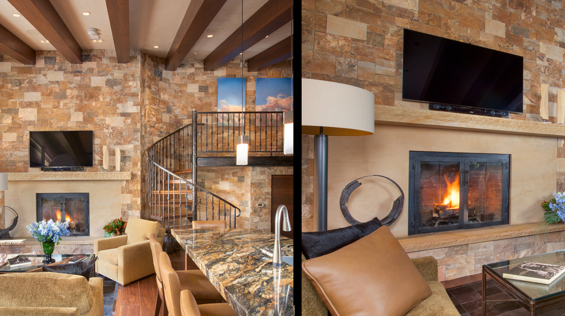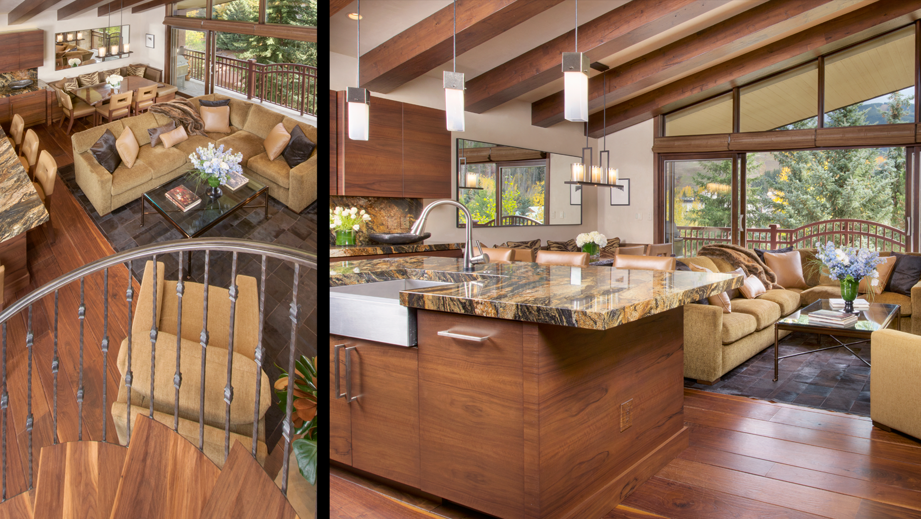 The client’s goal, on this transformational remodel of a 40 year old 1,000 SF 2 bedroom 2 bath condominium in the heart of Vail Village, was to reconfigure the entire unit to make it light filled and open and to utilize every square inch to maximize living and storage. We changed floor heights and completely reconfigured the living spaces to create an open great room with a very space efficient and cozy built in dining area that made room for an enlarge kitchen island for gathering and entertaining and a seating area focused on the rebuilt fireplace. Working with an exceptional design and construction team, we carefully studied every cabinet, banquet, built in bed, niche and closet to maximize space as one would do designing a boat, and cleanly detailed the palette of warm natural materials to create an inviting yet sophisticated mountain retreat.