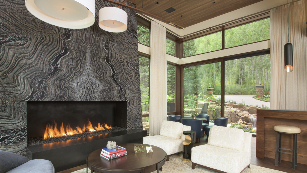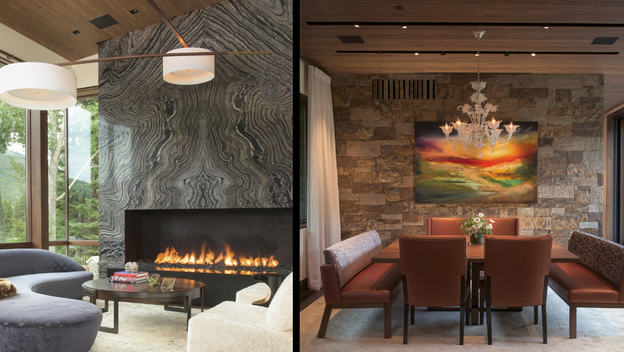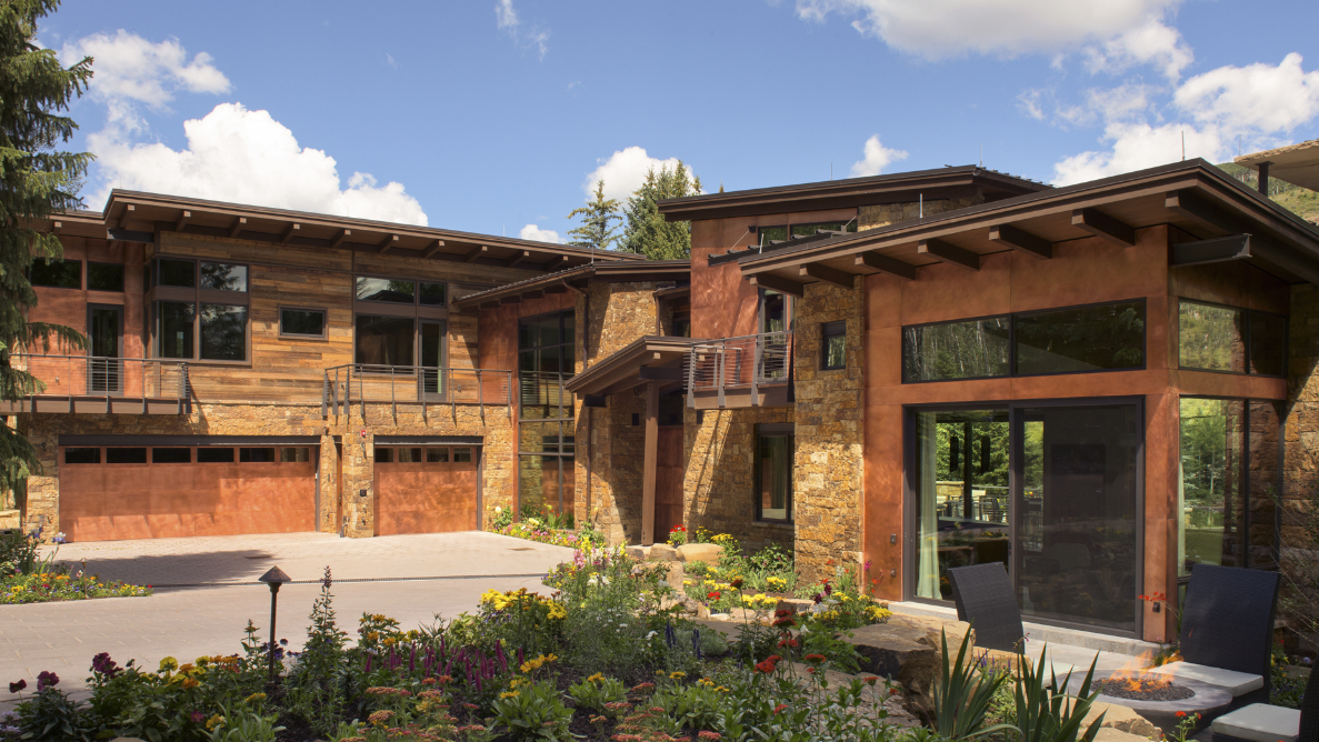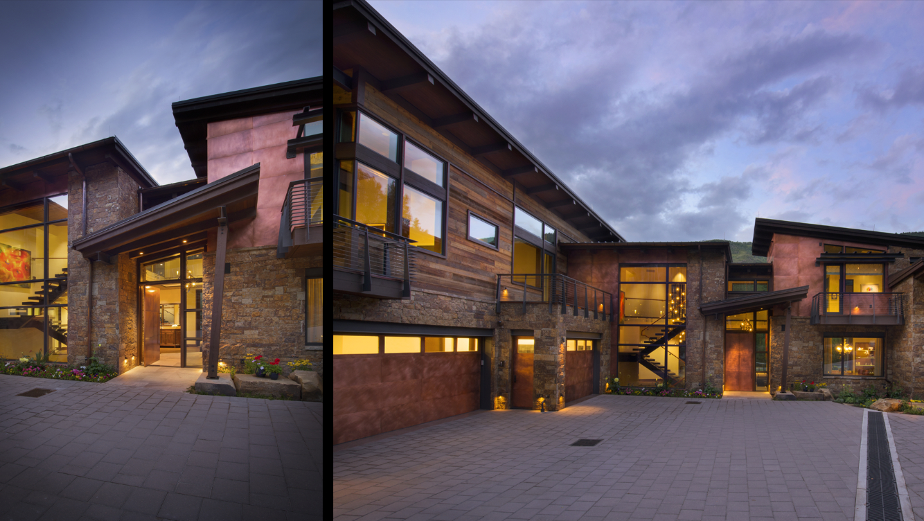 This 10,000 SF single family home was designed as a full-time residence for an active family with school aged children. The 6 bedroom, 8 ½ bathroom mountain contemporary home features a natural material palette that includes local stone, reclaimed wood siding, and copper paneling. Sloping shed roofs were utilized to maximize the ceiling heights at all levels and create the house’s unique and playful massing. The large wall openings at the lower and main levels contain lift and slide doors that are some of the largest single door panels available today. These openings provide the connection to the outdoors that allows the indoor living space to flow naturally to a generous deck at the main level and a pool area at the lower level. These exterior spaces showcase covered dining areas, a custom stainless steel spa, a large pool, and an outdoor television.