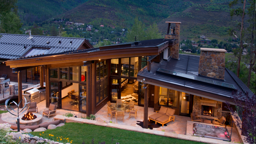 This new 4,500 SF 3BR 3.5 bath mountain modern home is attached via a bridge to the clients existing single family home built on the duplex lot in the in the 80s for which we also designed a substantial exterior update / remodel to harmoniously tie them together aesthetically. The great room, office, and master suite with his and her bathrooms linked together by an indoor shower as well as an outdoor shower are located on the 3rd level to capture views, take advantage of vaulted ceiling, and create indoor outdoor living on the generous covered on grade patios on the south side of the house since natural grade on the south side of the house aligns with the third level due to the steep 35% site slope. The house has a generously sized elevator as well as a dramatic open stairway to spatially connect the lower level entry space to the second level family room and to the great room on the third level. The lower level also has an over sized two car garage, mud room and mechanical spaces carved into the hill side, while the second level also has two guest bedrooms, laundry and an exercise / massage room also carved into the hill side. A 25' tall permanent shoring retaining wall was required to excavate for the foundation and to stabilize the hillside. The high roofs and the skylights at the covered outdoor kitchen/BBQ, outdoor living / dining and hot tub areas provide shelter and lots of natural light while built-in infared heaters in the ceiling provide warmth on cool nights.